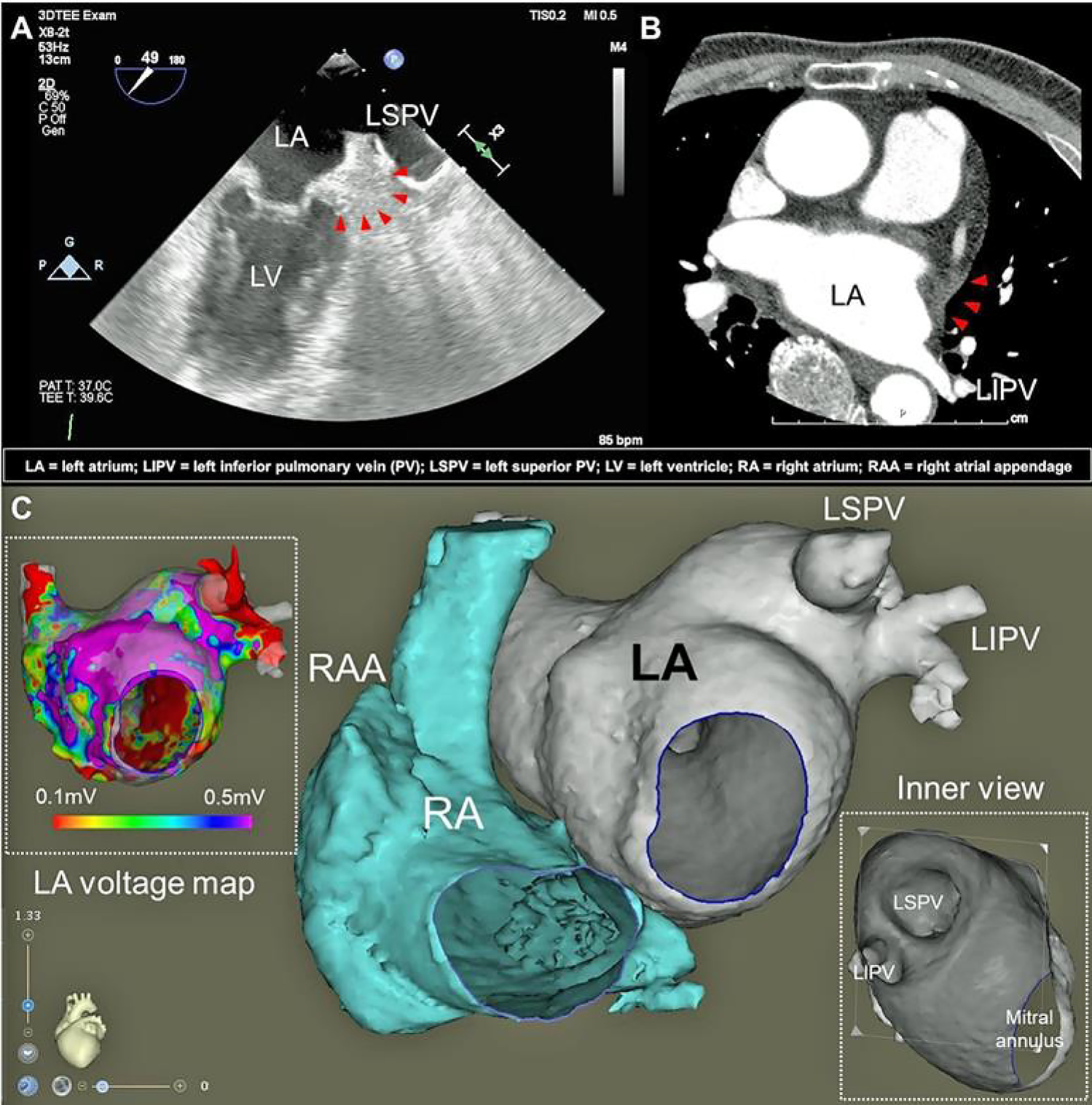 Congenital absence of left atrial appendage. (A) transoesophageal echocardiography, (B) three-dimensional cardiac computed tomography, (C) electroanatomic mapping