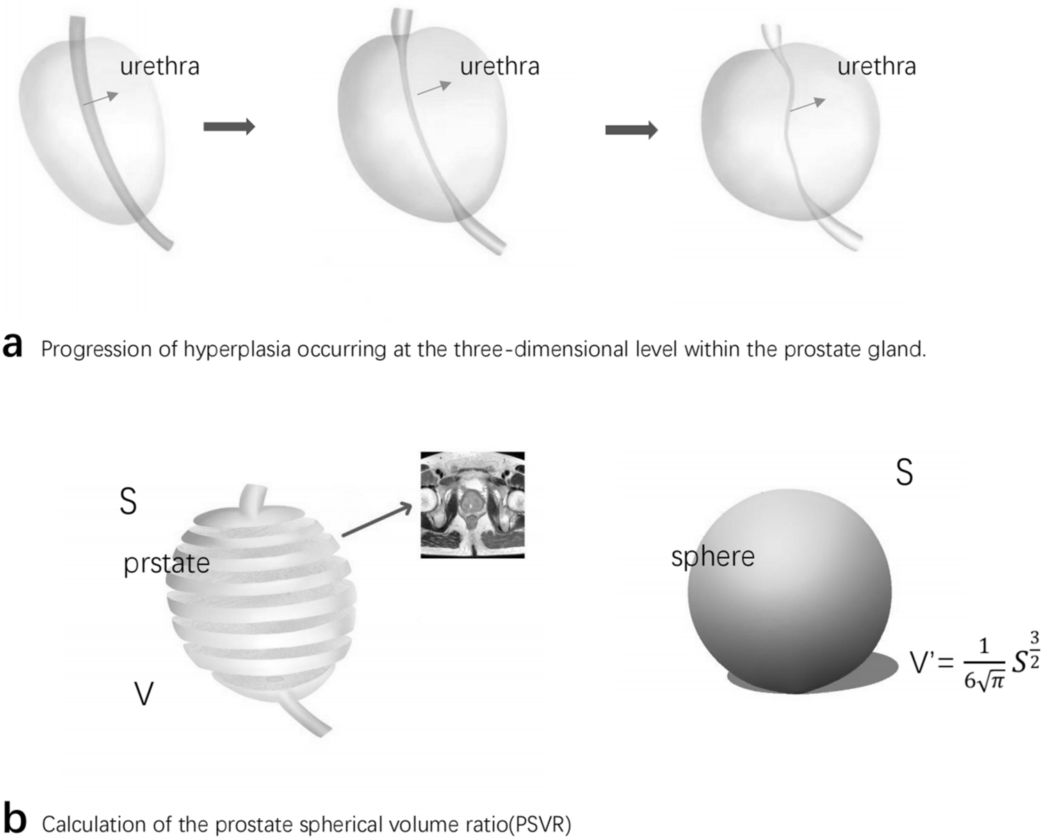 Progression of hyperplasia occurring at the three-dimensional level within the prostate gland and Calculation of the prostate spherical volume ratio(PSVR) a shows that with prostatic hyperplasia, the prostate morphology approximates a spherical shape and the urethra is compressed and thinned and delayed, leading to LUTS. b We constructed the prostate morphology from the magnetic resonance T2-weighted cross-sectional images by three-dimensional modeling and calculated the surface area (S) and volume (V) of the prostate.The volume (V') was calculated from the sphere with the same surface area (S).According to the equation of surface area and volume of a sphere \(V^{\prime } = \frac{1}{{6\sqrt {\uppi } }}{{S^{3/2} }}\) PSVR = V/V’