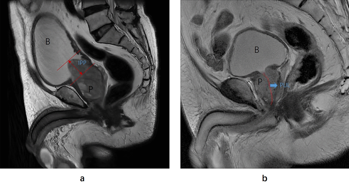 The measurement of the intravesical prostatic protrusion (IPP) and prostatic urethral length (PUL) on T2-weighted sagittal magnetic resonance imaging: a IPP is the vertical length from the protrusion of the prostate (P) to the base of the bladder B. The red line represents the IPP measurement. This patient is 72 years old with an IPP of 25.3 mm. b PUL is the length from the base of the prostate (P) to the apex of the prostate in midsagittal on MRI. The red line represents the PUL measurement. This patient is 68 years old with a PUL of 4.5 cm