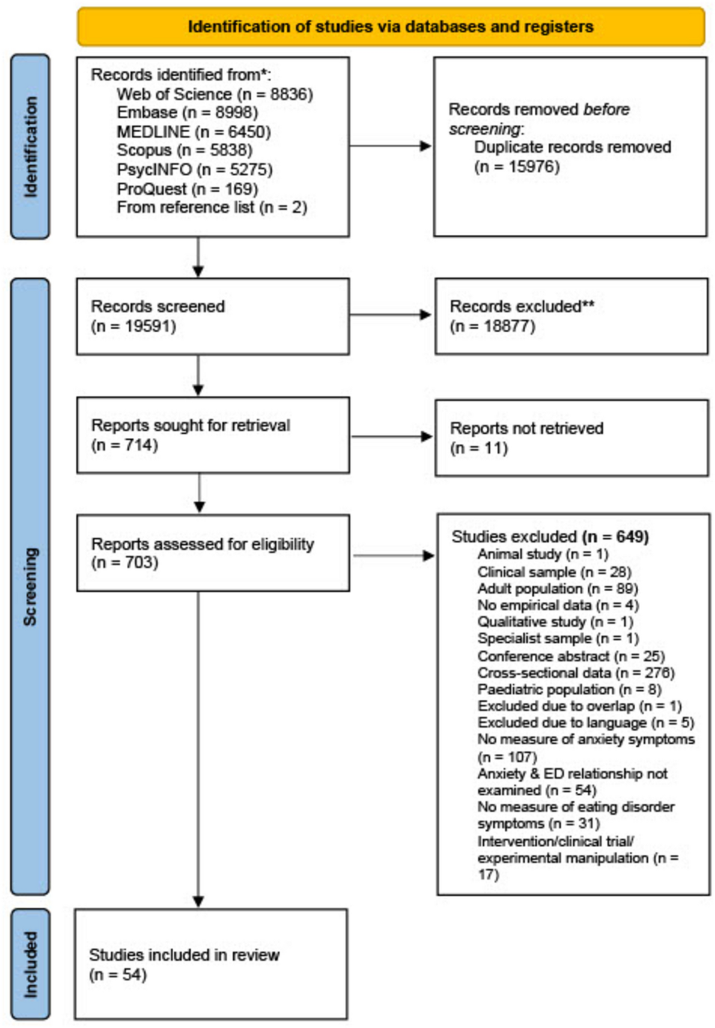 Herpertz-Dahlmann et al. [46] | Germany | 6 years | 771 | 54.5% | 14.3 (2.0) | NR | Screen for Child Anxiety-Related Emotional Disorders questionnaire (SCARED) | Sick, Control, One stone, Fat, Food (SCOFF) |