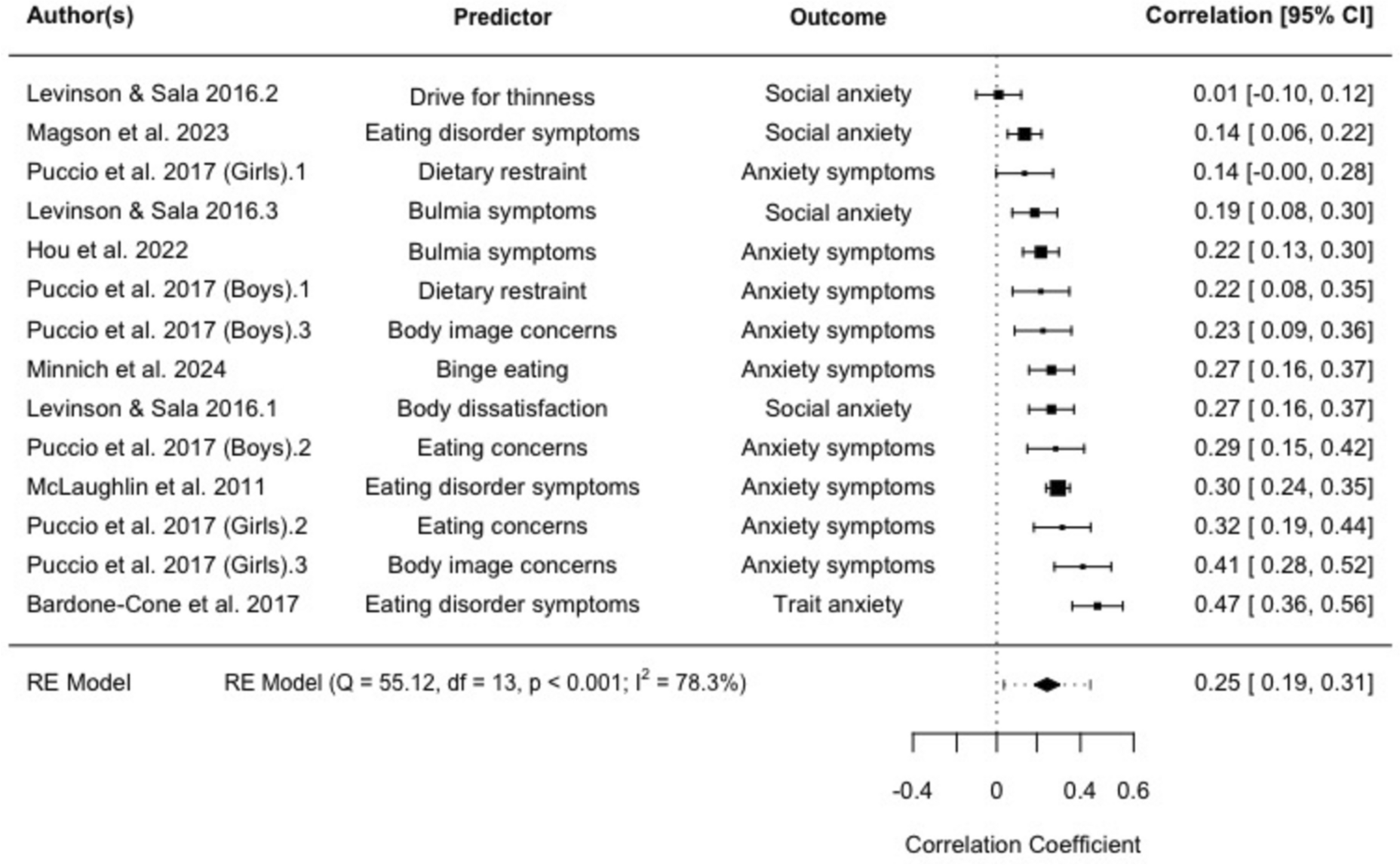 Levinson and Sala, (2016) [29] | US | 6 months | 300 | 100% | 18 (median) | Caucasian (60.7%), Asian (19.3%), Black (4.0%), Hispanic (2.7%), multi-racial (5.0%)) | The Social Interaction Anxiety Scale (SIAS) & Brief Fear of Negative Evaluation (BFNE) scale & Penn State Worry Questionnaire (PSWQ) | The Eating Disorder Inventory-2 (EDI-2) |