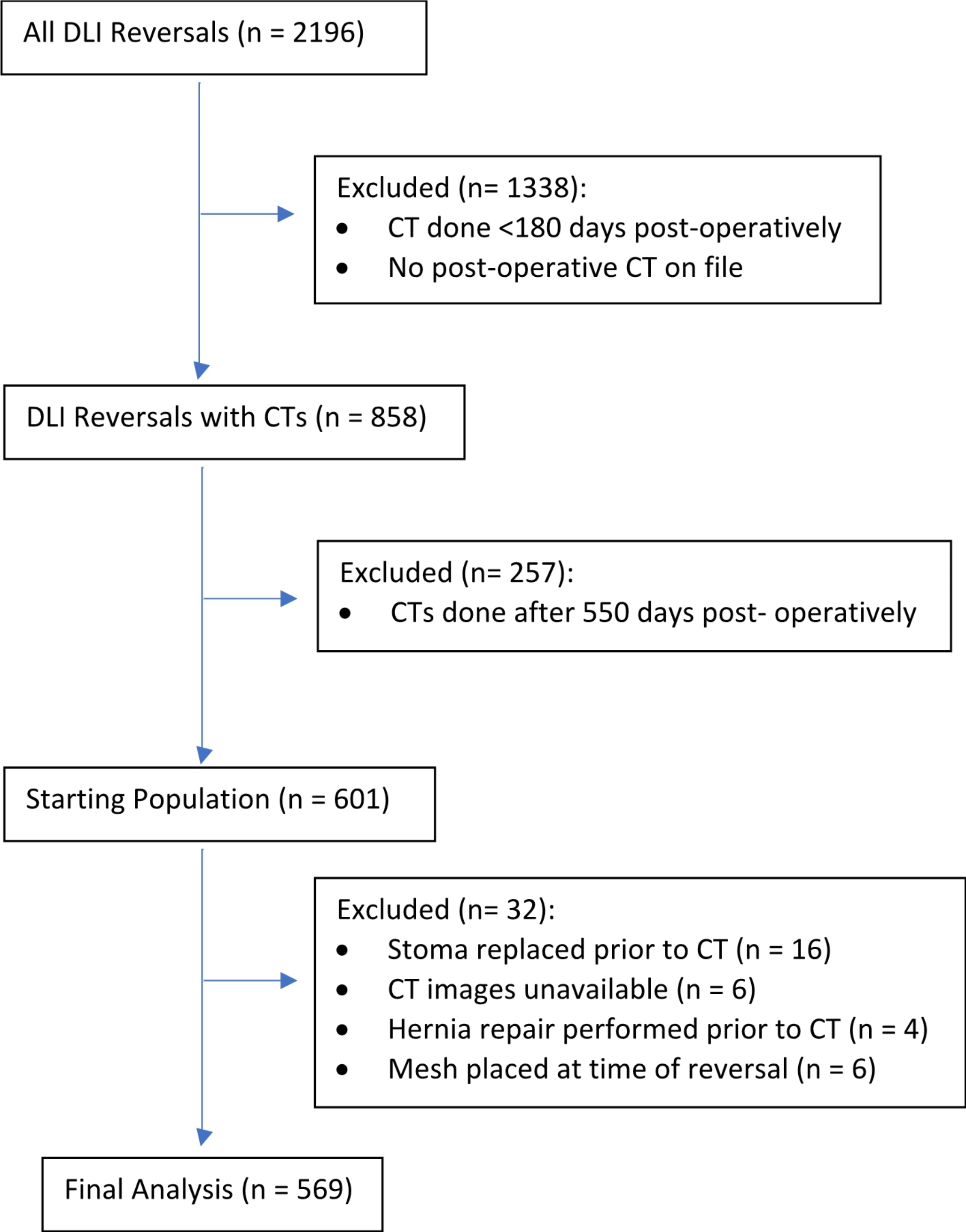 Data collected from the electronic medical records included patient demographics, operative data, radiographic data, and medical history. Demographic data included age, sex, race, body mass index (BMI), and ethnicity. Operative data included case length, length of stay (LOS), presence of parastomal hernia noted by the surgeon on the operative report, estimated blood loss (EBL), and ASA rating. The method of closure of the stoma site, including the suture type used for closure, technique for closing the fascia, and surgical approach, was assessed in all cases. Operative technique was left to surgeon discretion. Radiographic data included the date of CT and CT type. CT scans for any indication (i.e., symptomatic hernia, evaluation of alternative disease processes, routine evaluation) were included in the analysis and needed to be performed within 1 year ± 6 months from the date of DLI-R. Medical history included a history of diabetes (DM), myocardial infarction (MI), coronary artery disease (CAD), congestive heart failure (CHF), stroke or transient ischemic attack (TIA), peripheral vascular disease (PVD), chronic obstructive pulmonary disease (COPD), liver disease, chronic kidney disease (CKD), and smoking history. Indications for initial DLI included but were not limited to the management of rectal cancer, inflammatory bowel disease (IBD), diverticulitis, dysmotility, colon cancer, and polyposis. The primary endpoint was the rate of ISIH as defined by the presence of hernia on CT, as CT is the optimal method for diagnosing incisional hernia [