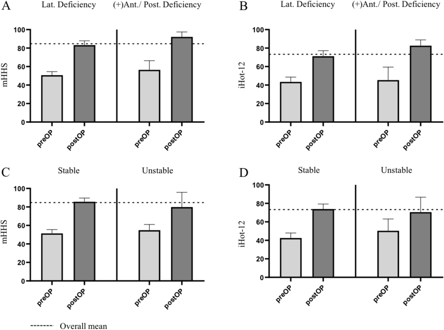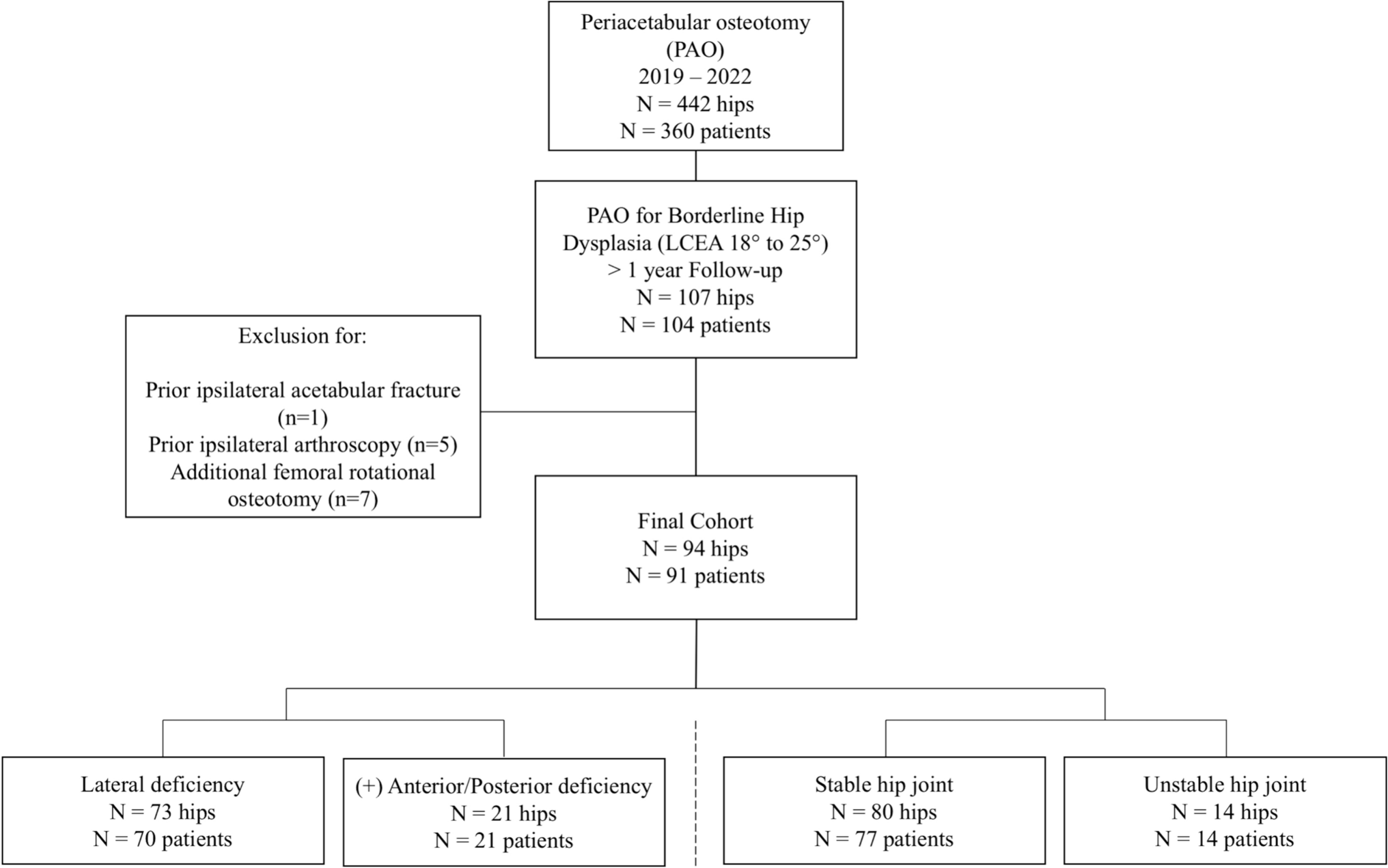 A prospective monocentre study was conducted. Patients enrolled underwent PAO for symptomatic BHD (LCEA, 18°–25°). A total of 107 hips were included with 94 complete data sets were available for evaluation with a minimum follow-up of 1 year and a mean follow-up of 2.3 years. The mean age was 31 ± 8.2 years, and 81.3% were female. As the primary outcome measure, we utilized the modified Harris hip score (mHHS) with minimal clinically important change (MCID) of eight to define clinical failure. Results were compared after a comprehensive radiographic assessment distinguishing between lateral deficient vs. anterior/posterolateral deficient acetabular and stable vs. unstable hip joints.