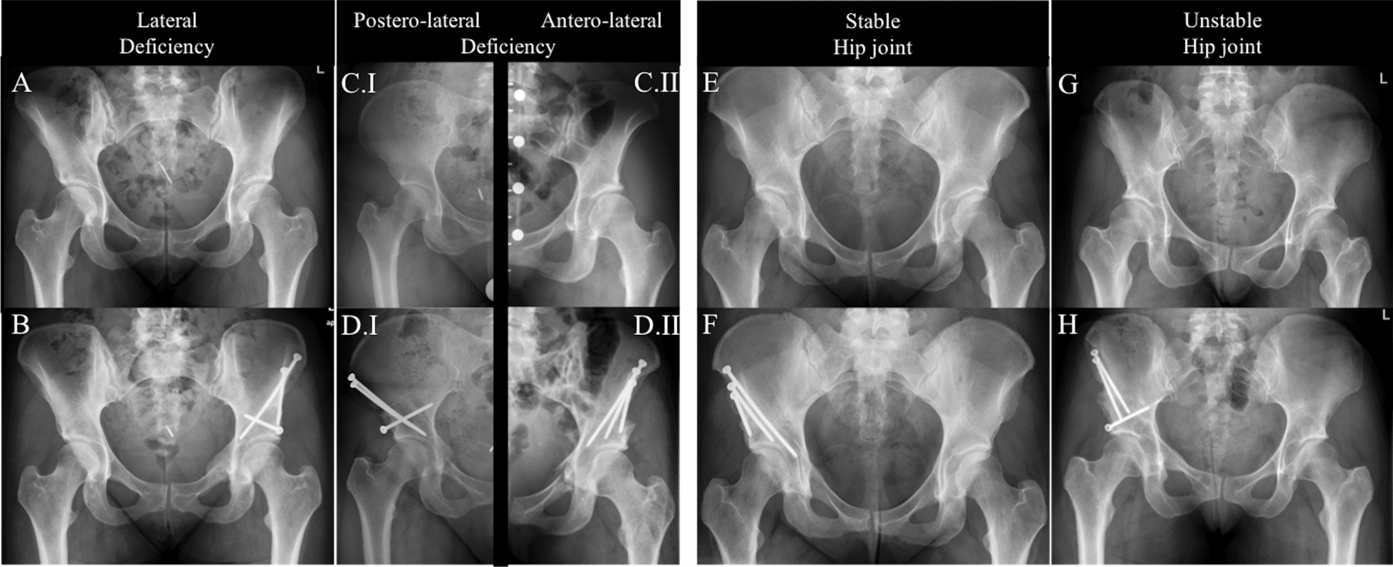 Representative patient cases with different acetabular and hip joint morphologies: pre-(A/C/E/G) and postoperative (B/D/F/H) anterior–posterior pelvic radiographs