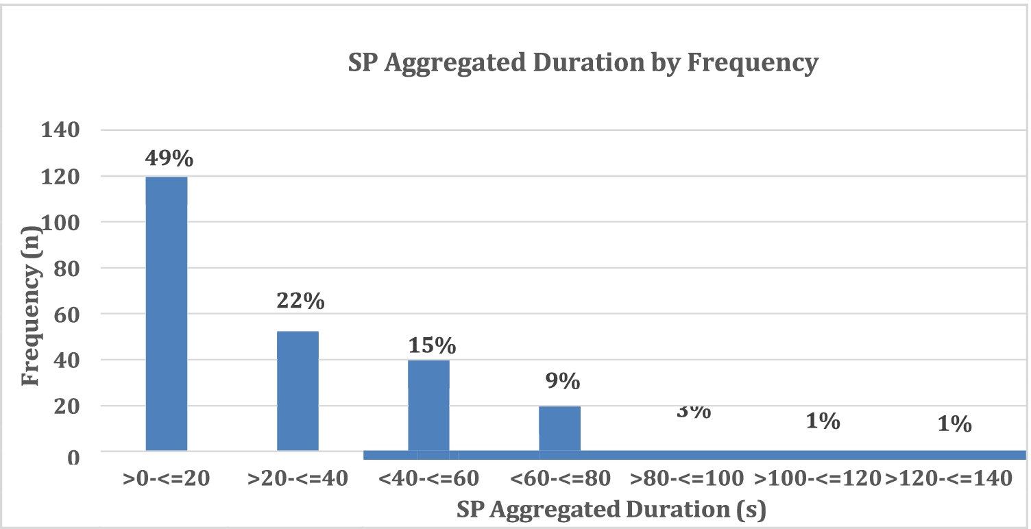 Of the total sample (N = 291), 239 (82%) maternal–infant dyads experienced SP moments [SP occurrence], displaying a median of 5 (IQR: 1–11) SP moments [SP frequency]. The maximum number of SP moments recorded in a single dyad was 31, with 50% of dyads having ≤ 5 moments. The minimum duration of an SP moment was 0.5 s and the maximum 28 s. The maximum aggregated duration for all SP moments was 133 s. The median aggregated duration of SP moments [SP Sum] was 16 s (IQR: 3–36 s), with a median SP short-average of 3 s (IQR: 2–4 s). The aggregated duration and frequency of SP moments are presented in Fig. 1.