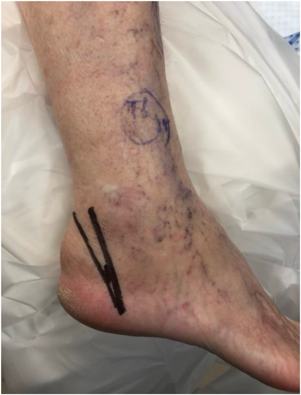 Preoperative, lateral clinical image of Haglund’s Deformity; marked prior to Zadek Osteotomy