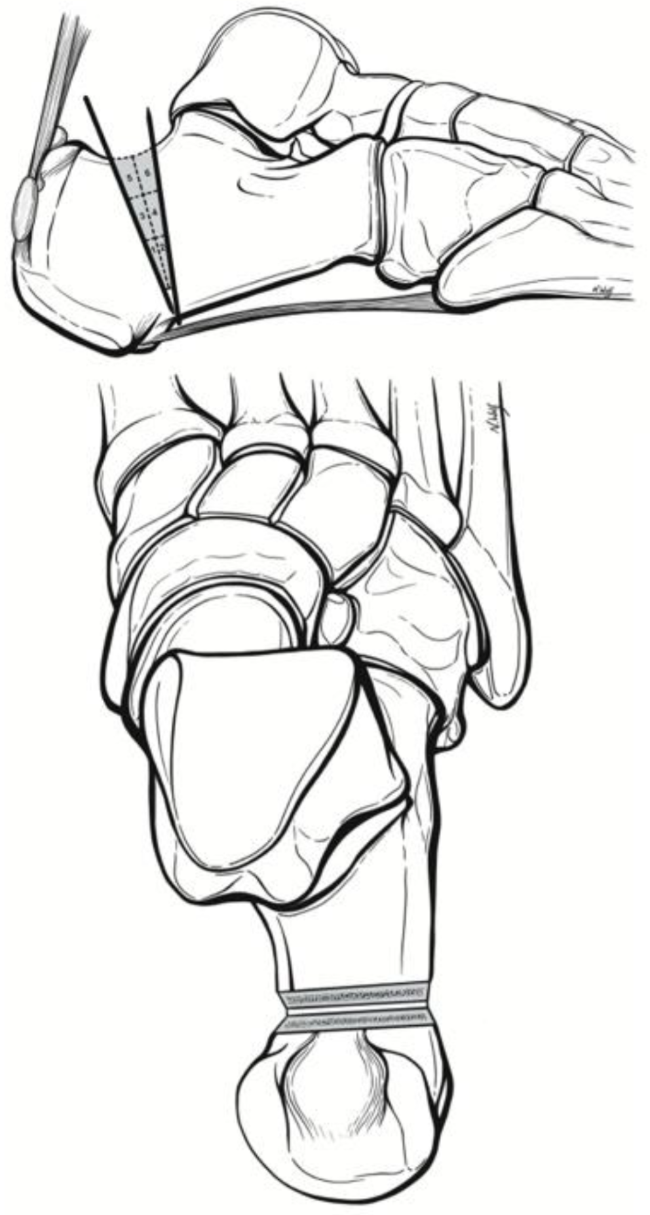 A small 5 mm lateral calcaneal incision was made at the apex of the ZO, ~ 5–8 mm from the plantar cortex just anterior to the insertion of the plantar fascia at the calcaneal tuberosity. A blunt straight hemostat was used to spread down to bone prior to burr placement. A 3 mm x 30 mm Shannon burr (Novastep, Englewood Cliffs, New Jersey) was advanced into the lateral calcaneus at the apex of the osteotomy and its position was confirmed on lateral fluoroscopy view of the foot [3]. The osteotomy was then complete with Shannon burr. Copious cooled irrigation along with a pulsed burr technique was used throughout burring to reduce the heat generated at the osteotomy site, as described previously [18]. Great care was taken to maintaining a plantar cortical hinge of 5–8 mm of bone (Fig. 2).