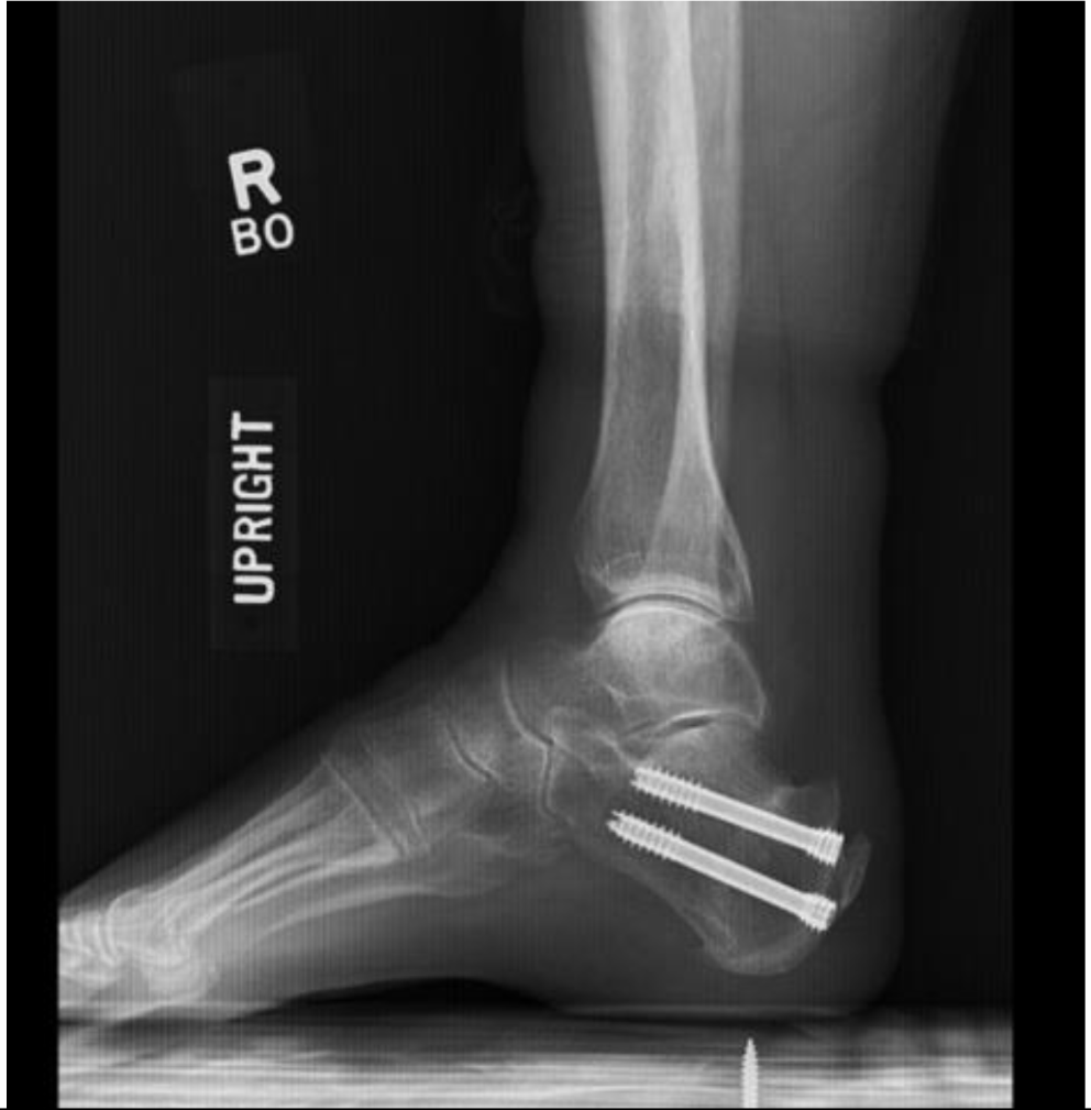 The osteotomy was reduced with maximal ankle dorsiflexion to reduce the osteotomy. Two 7.0 mm headless compression screws were advanced across the osteotomy with the ankle in maximal dorsiflexion. Implant position was confirmed on lateral and Harris axial fluoroscopy views of the calcaneus. Incisions were irrigated with normal saline and closed with 3 − 0 nylon sutures. Patients are made immediately weightbearing as tolerated in a Controlled Ankle Motion boot. Patients were allowed to transition into normal shoes by six-weeks postoperation.