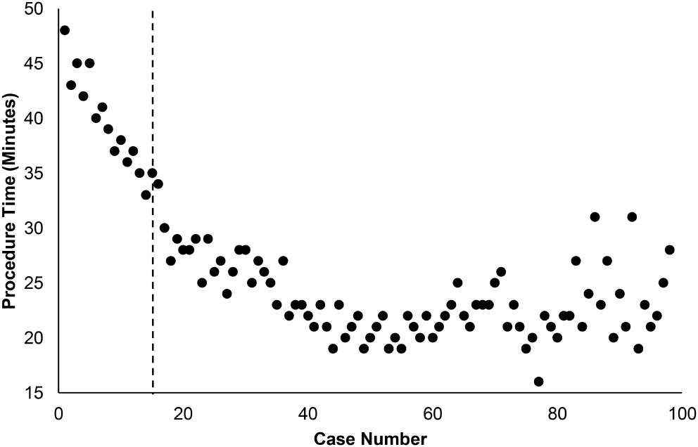 OR time vs. surgeon experience (case number). Cases decreased in duration significantly until case 14, as determined by ANOVA (p < 0.05, indicated by dotted line). At this point OR time plateaus, suggesting the learning curve has been overcome