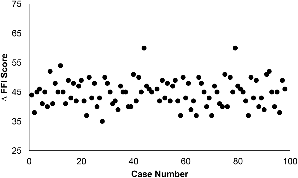 Postoperative change in Functional Foot Index (FFI) scores vs. increasing surgeon experience (case number). There was no statistical difference detected by ANOVA