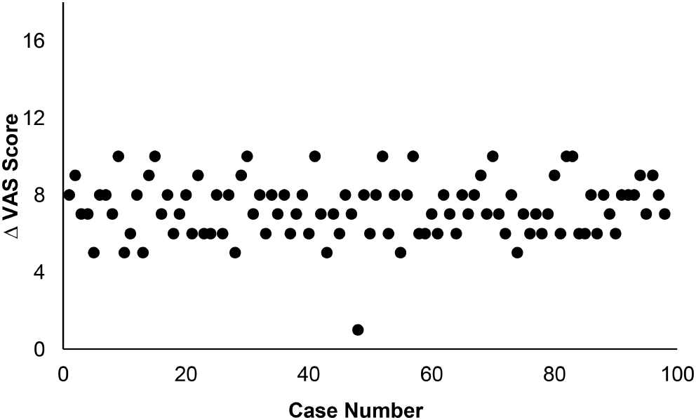 Postoperative change in Visual Analogue Scores (VAS) vs. increasing surgeon experience (case number). There was no statistical difference detected by ANOVA