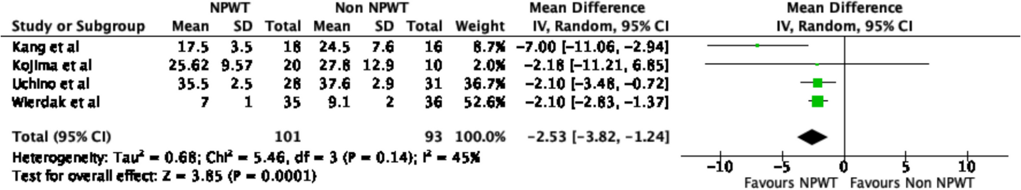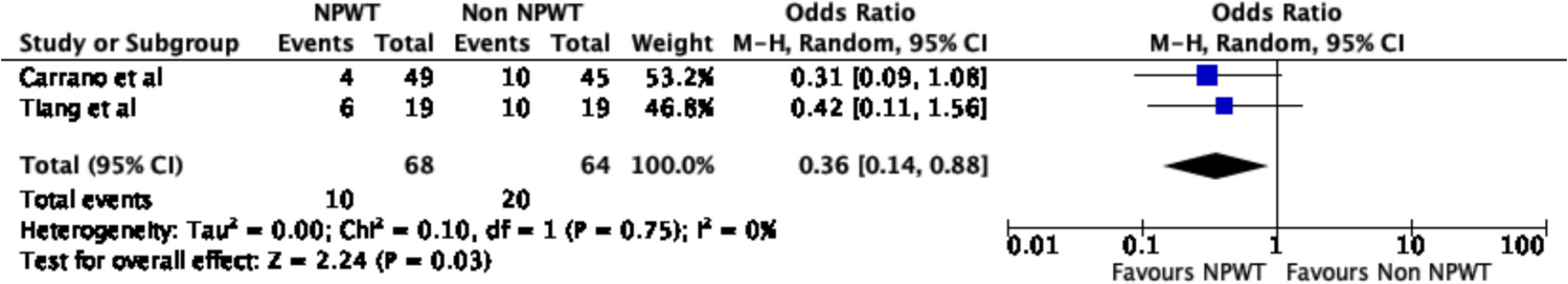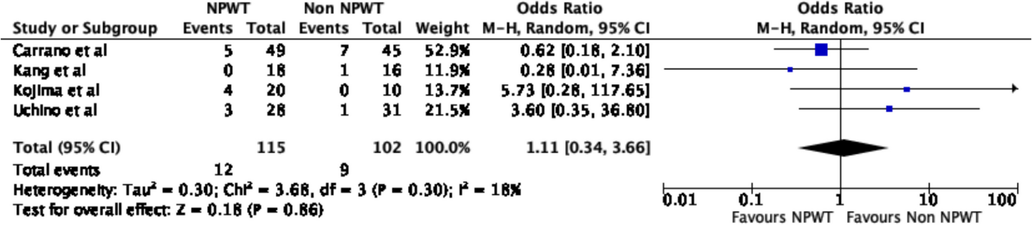Statistical analysis was performed using Review Manager version 5.3 (The Nordic Cochrane Centre, The Cochrane Collaboration, Copenhagen, Denmark). Binary outcome data was reported as odds ratios (OR) with 95% confidence intervals (CI) estimated using the Mantel–Haenszel method. An OR of below 1 favors NPWT. For continuous data, standard mean difference (MDs) and 95% CI were estimated using inverse-variance weighting. Outcome measures were recorded as mean (s.d) or median (i.q.r) based on available data. Heterogeneity was assessed by means of I2 statistics, with considerable heterogeneity considered with a value of higher than 0%. Pooled estimates of differences were calculated using random-effects models, accounting for potential interstudy heterogeneity. Sensitivity analyses were carried out where appropriate. P < 0.05 was considered significant. Quality of included RCTs was assessed independently by two authors using the JADAD/Oxford quality scoring system.