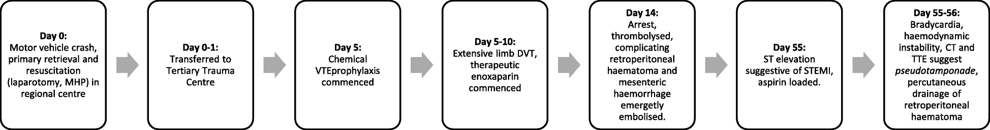 The case presented outlines the sequence of events following a motor vehicle crash (summarised in Fig. 1). A man sustained multiple injuries and was transferred from a regional hospital to a tertiary trauma centre for definitive care. Fourteen days into his stay the patient was thrombolysed during an in-hospital cardiac arrest for presumed pulmonary embolus. Thrombolysis was complicated by a large retroperitoneal haematoma with mass effect, resulting in gastric obstruction, manifesting as an inferior myocardial infarction mimic through cardiac compression.