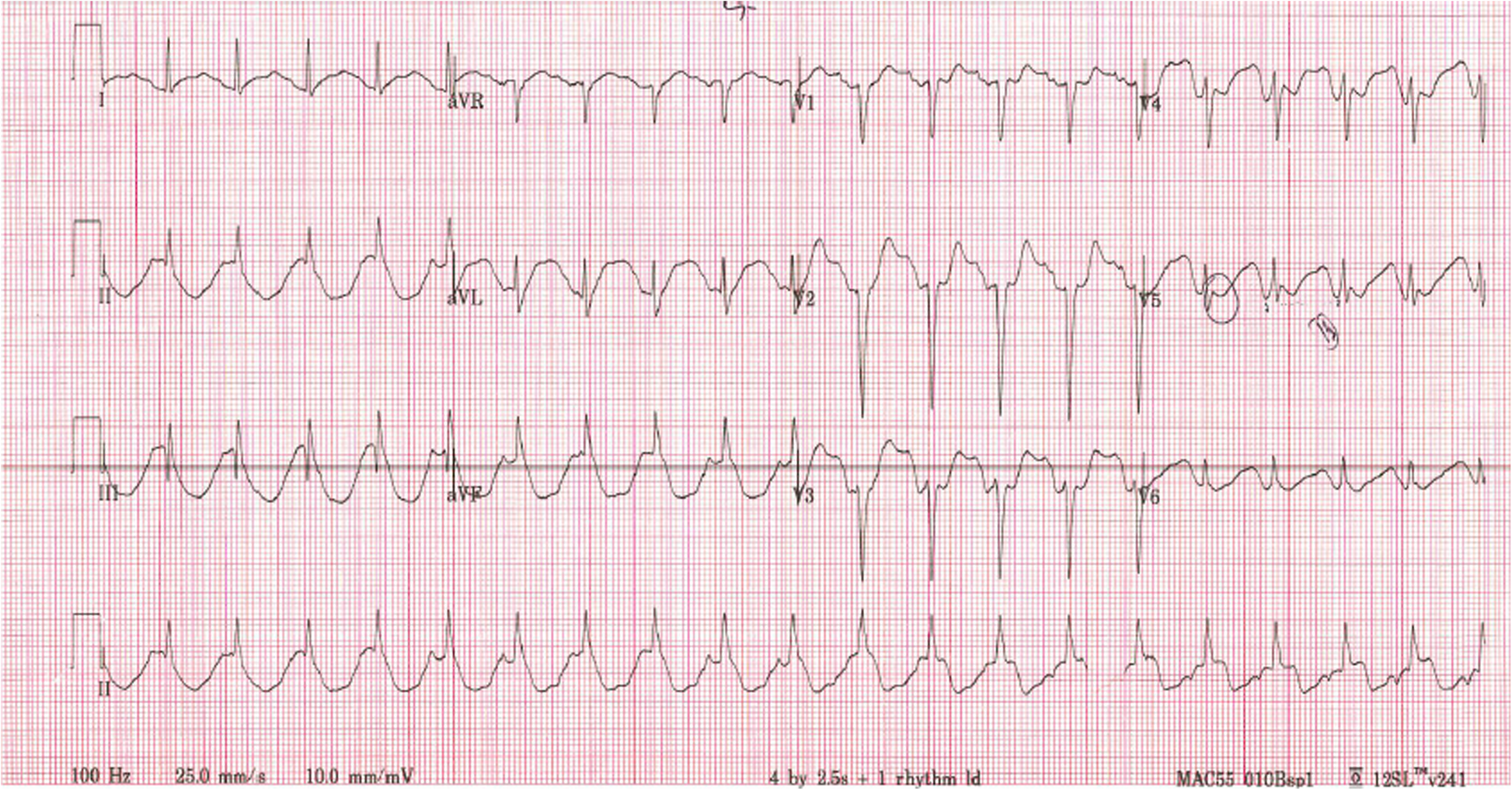 Delirium made assessment for chest pain difficult with the patient becoming increasingly agitated. Aside from his sinus tachycardia, his blood pressure and mean arterial pressure (MAP) were initially within normal range and he had no clinical evidence of heart failure. A loading dose of 300 mg of aspirin was administered whilst awaiting serial high sensitivity troponin (hsTNI), which were subsequently negative. Full blood count and electrolytes were all within normal range. His Electrocardiogram (ECG) evolved much like inferior myocardial infarction pattern (complicated by right ventricular involvement) over the next 2 h as shown in Figs. 3 and 4.