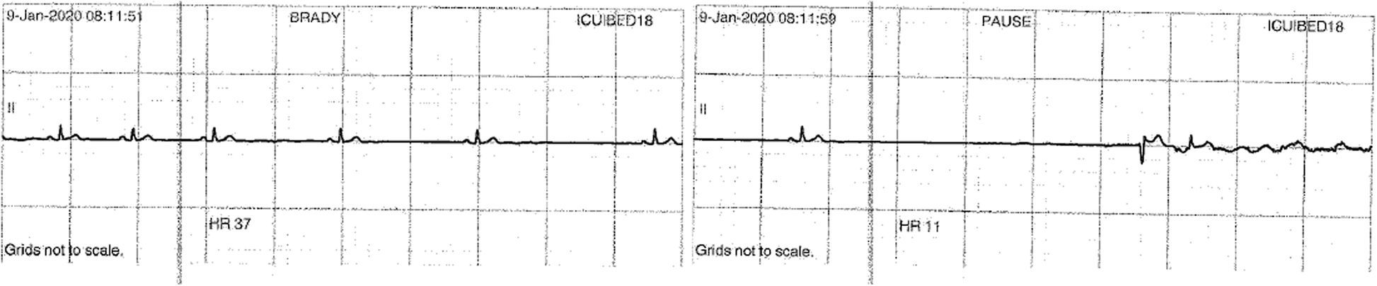 During this time a worsening bradycardia evolved with progressive haemodynamic instability. The patient became less alert, with episodes of profound hypotension (MAP as low as 30 mmHg). An adrenaline infusion was rapidly up-titrated as differentials were considered.