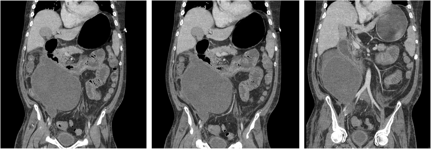 Coronal CT sections showing a large retroperitoneal haematoma, duodenal compression and gastric distension and a distorted left ventricle