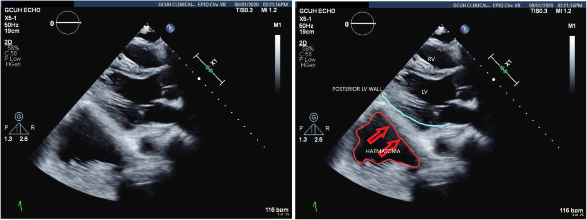 The haematoma was rapidly drained by the Interventional Radiologist yielding more than 1500 mL of liquefied haematoma at insertion. This resulted in a return to normal sinus rhythm, no further ECG changes and a swift resolution of shock. A later coronary angiogram showed no stenotic lesions removing the possibility of coronary artery disease contributing to the pathophysiology.
