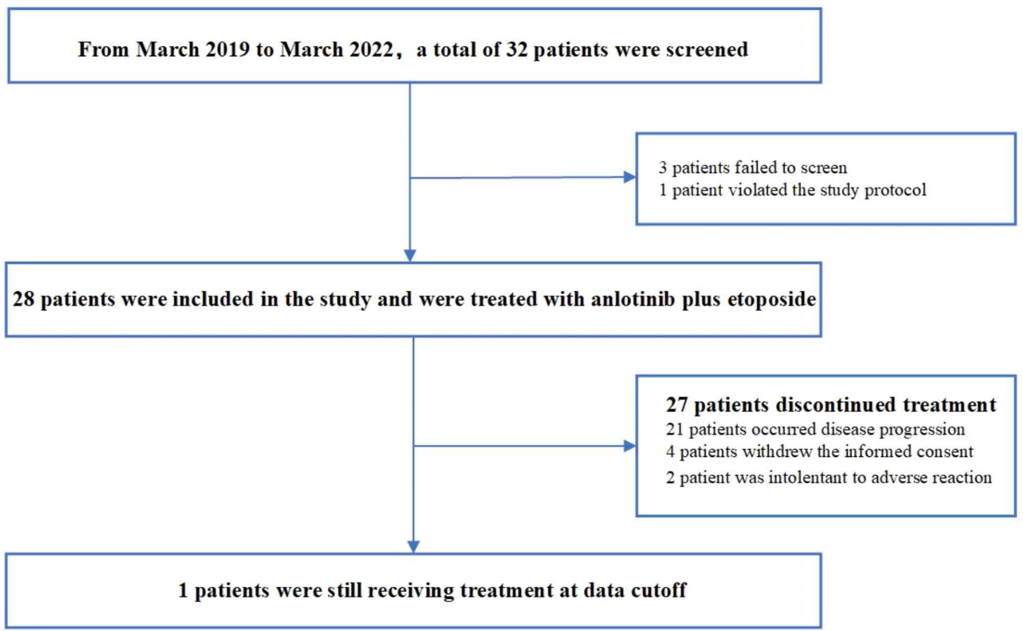 All patients underwent baseline imaging assessment after enrollment. The participants started treatment within 3 weeks (21 calendar days) from screening. All participants were administered anlotinib plus etoposide. Specifically, all participants were treated with oral anlotinib 12 mg q.d. on days 1–14 of 21-day cycles. Three weeks (21 d) were considered as one cycle. Anlotinib was continually administered until disease progression, consent withdrawal, or intolerable toxicity. The participants were also treated with oral etoposide 50 mg on days 1 to 14 of 21-day cycles. Etoposide treatment lasted for six cycles maximum.
