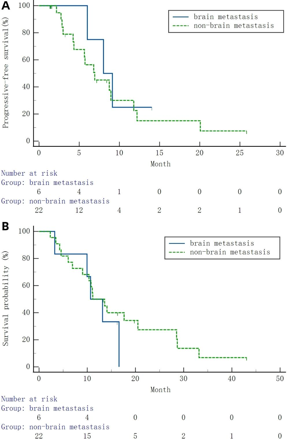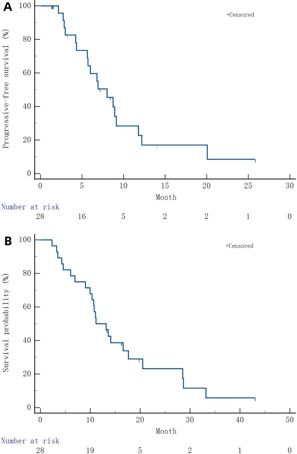 Data were analyzed with SPSS 22.0 (SPSS, USA). Normally and skewedly distributed continuous variables were presented as mean ± standard deviation and median (range), respectively. Categorical variables were presented as n (%). Kaplan-Meier curve analysis was utilized to estimate PFS and OS.