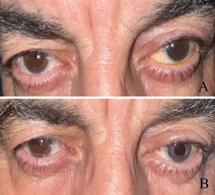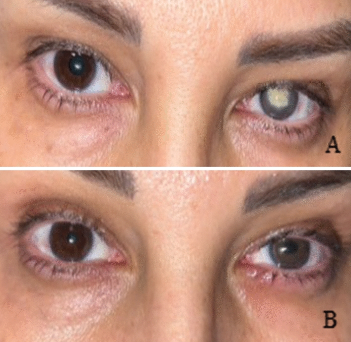 At the end of the procedure, a bandage contact lens was placed for all cases and continued for 3 weeks or up to completion of corneal epithelial healing. Topical antibiotic drop (levofloxacin 0.5%) was administered four times daily up to bandage contact lens removal. Topical steroid drop (betamethasone 0.1%) was administered four times daily and tapered during 1 month. Topical autologous serum 20% drop four times daily besides frequent topical artificial tears drop was also prescribed. Follow-up visits were 1 day post-operative, 3 weeks post-operative, and every 3 months for an unlimited period based on patient satisfaction or any complaints.