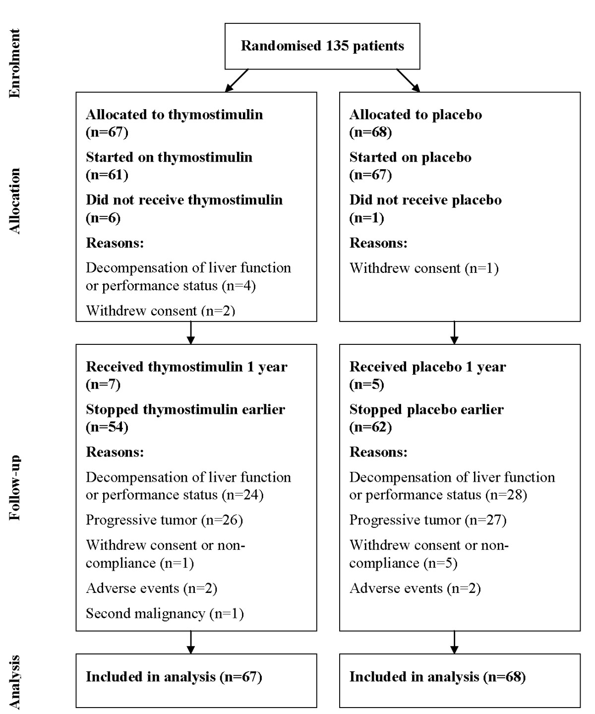 Thymostimulin is a licensed immunomodulating drug prepared from an extract of peptides from bovine thymus glands (Thymophysin CytoChemia® 25/50). Following removal of high-molecular cell components and proteins, the low-molecular active thymus peptides are isolated and standardized to a defined protein fraction. Before central randomization via fax patients were stratified according to liver function (Child classification) and treatment before study entry (received or not received). They were assigned covariate-adapted to each center to either thymostimulin 75 mg or placebo subcutaneously 5 days a week for one year in addition to best supportive care. Study medication (verum and placebo) was coded and labeled to guarantee blinding with the first five injections performed by a medical doctor. Further injections were administrated by the patients themselves or home care workers and registered in a treatment diary. Drug accountability procedures, reporting of (serious) adverse events and source data verification were implemented as part of the trial monitoring according to standard operating procedures conducted by external monitors. Treatment with the study medication was continued for one year or until one of the following criteria was met: disease progression, decompensation of liver function (bilirubin > 5 mg/dl, INR ≥ 2.3) or performance status (Karnofsky score < 50%), unacceptable toxicity, patient refusal or incompliance.