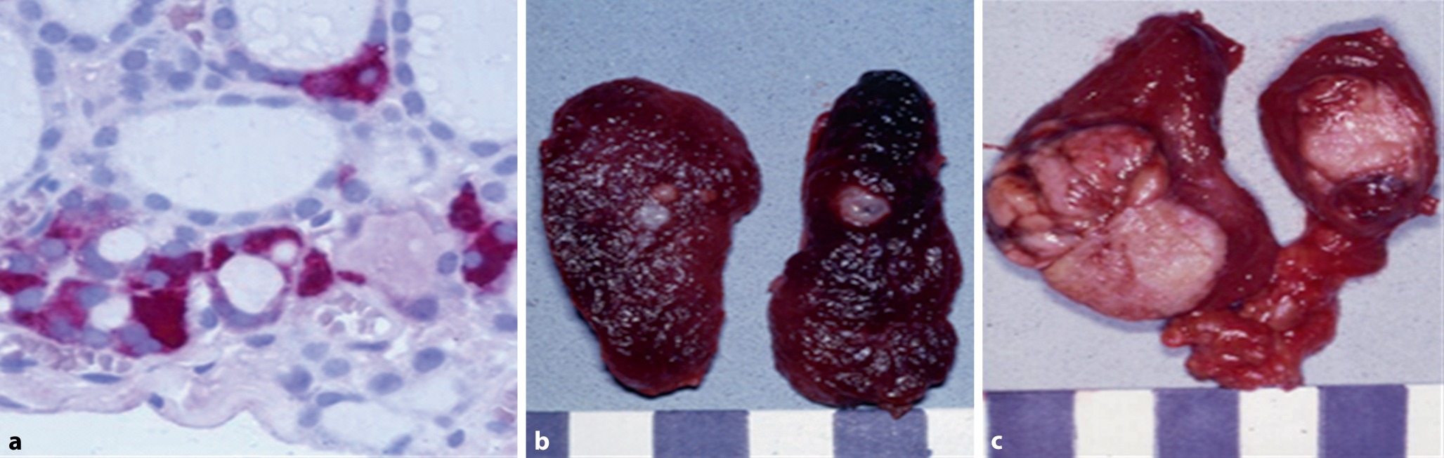 Neoplastische C‑Zell-Hyperplasie (a), hereditäres medulläres Mikrokarzinom (b) und hereditäres medulläres Makrokarzinom (c). a Immunhistochemie der ersten DNA-basierten prophylaktischen Thyreoidektomie des Erstautors am 15.09.1994 bei einem 6‑jährigen Jungen mit Mutation im Codon 634