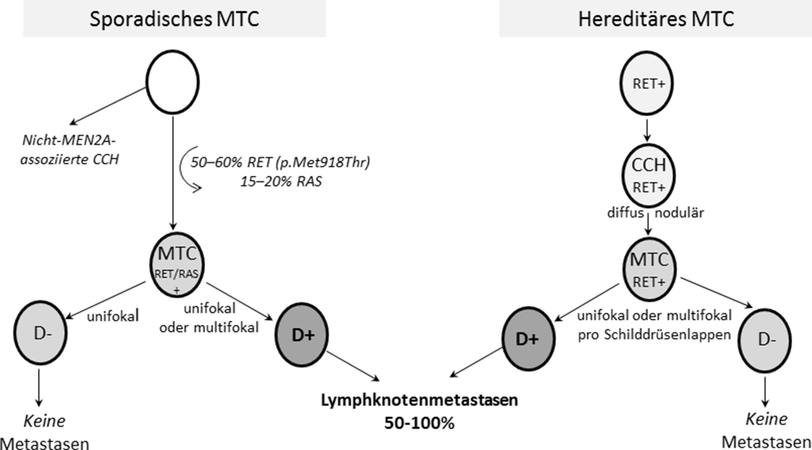 Das pathologische Konzept: Histopathogenese des sporadischen und hereditären MTC. CCH C-Zell-Hyperplasie, D−/D+ Desmoplasie negativ/positiv, MTC medulläres Schilddrüsenkarzinom; RETREarranged-during-Transfection-Protoonkogen