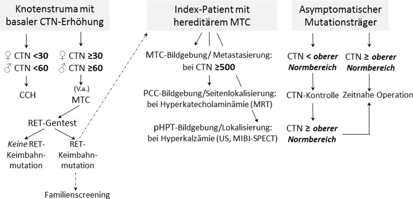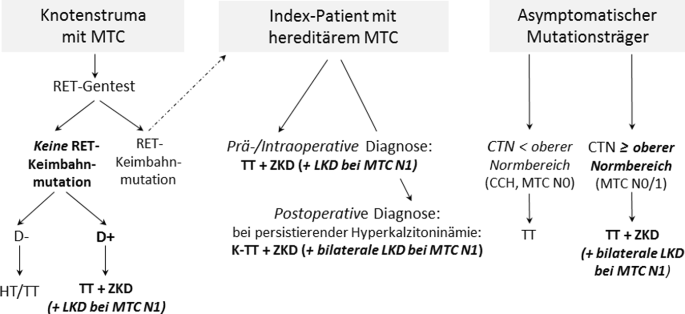 Innerhalb dieser Patientenpopulation hängt die Wahrscheinlichkeit der Frühdiagnose eines MTC von den individuellen Befunden, insbesondere der Höhe des als pathologisch definierten Kalzitoningrenzwertes ab. Bei Frauen mit einem Kalzitoninwert über 30 pg/ml bzw. bei Männern über 60 pg/ml liegt höchstwahrscheinlich ein MTC vor [60]. Bei ca. 25 % aller Patientinnen und Patienten mit MTC findet sich eine Keimbahnmutation im RET-Protoonkogen. Bis zu 10 % dieser De-novo-Keimbahnmutationen sind in den Keimzellen phänotypisch gesunder Eltern, insbesondere des Vaters aufgrund der größeren Zahl von Zellteilungen bei der Spermatogenese [63‐65], entstanden oder betreffen neu diagnostizierte solitäre MTC, die bei negativer Familienanamnese primär als sporadisch eingeschätzt wurden [66]. In Deutschland besteht daher im Gegensatz zu den USA [67] Konsens in der Empfehlung zur routinemäßigen Kalzitoninbestimmung bei Patientinnen und Patienten mit Knotenstrumen [59, 60], um medulläre Karzinome zunächst unabhängig von ihrer genetischen Disposition frühzeitig zu diagnostizieren und beim Nachweis einer RET-Mutation entsprechend chirurgisch zu entfernen. Beim hereditären MTC ist eine totale Thyreoidektomie immer erforderlich, beim sporadischen MTC nur dann, wenn ein desmoplasiepositives MTC oder zusätzlich eine bilaterale Knotenstruma vorliegt [23]. Die initiale Kalzitoninbestimmung mit nachfolgender RET-Genanalyse ist daher nicht nur für die frühzeitige Erkennung von Indexpatienten wichtig, sie hat auch eine wesentliche Bedeutung für die Planung des Operationsausmaßes.