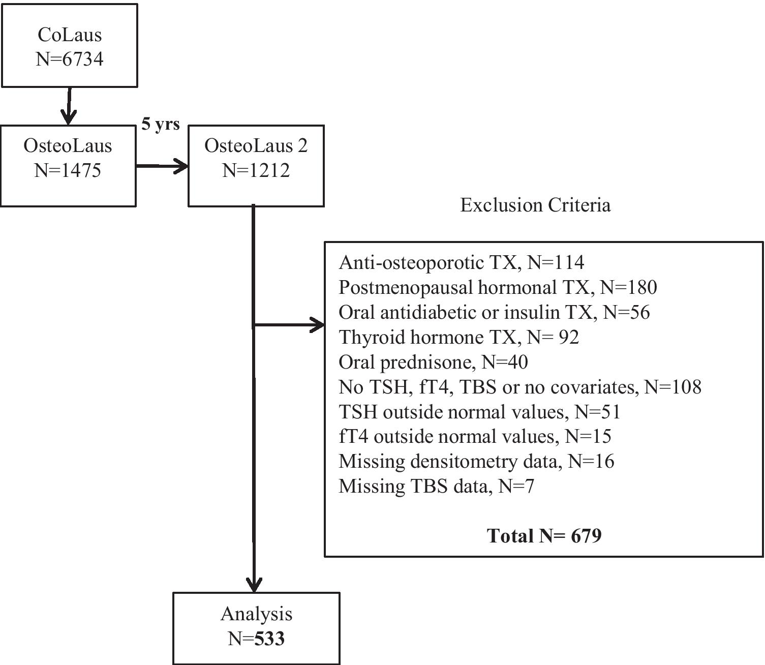 The study was retrospective. Participants in the 5-year follow-up of OsteoLaus were included (n = 1212). Blood TSH and free T4 were assessed at the first CoLaus follow-up, corresponding to the baseline OsteoLaus visit. Participants were sequentially excluded if they 1) had any anti-osteoporotic, antidiabetic, thyroid-modifying, hormone replacement or systemic corticoid treatment; 2) had no TSH or fT4 data, or no covariates; 3) presented with TSH or fT4 levels outside the normal reference values, and 4) had no densitometry or TBS data.