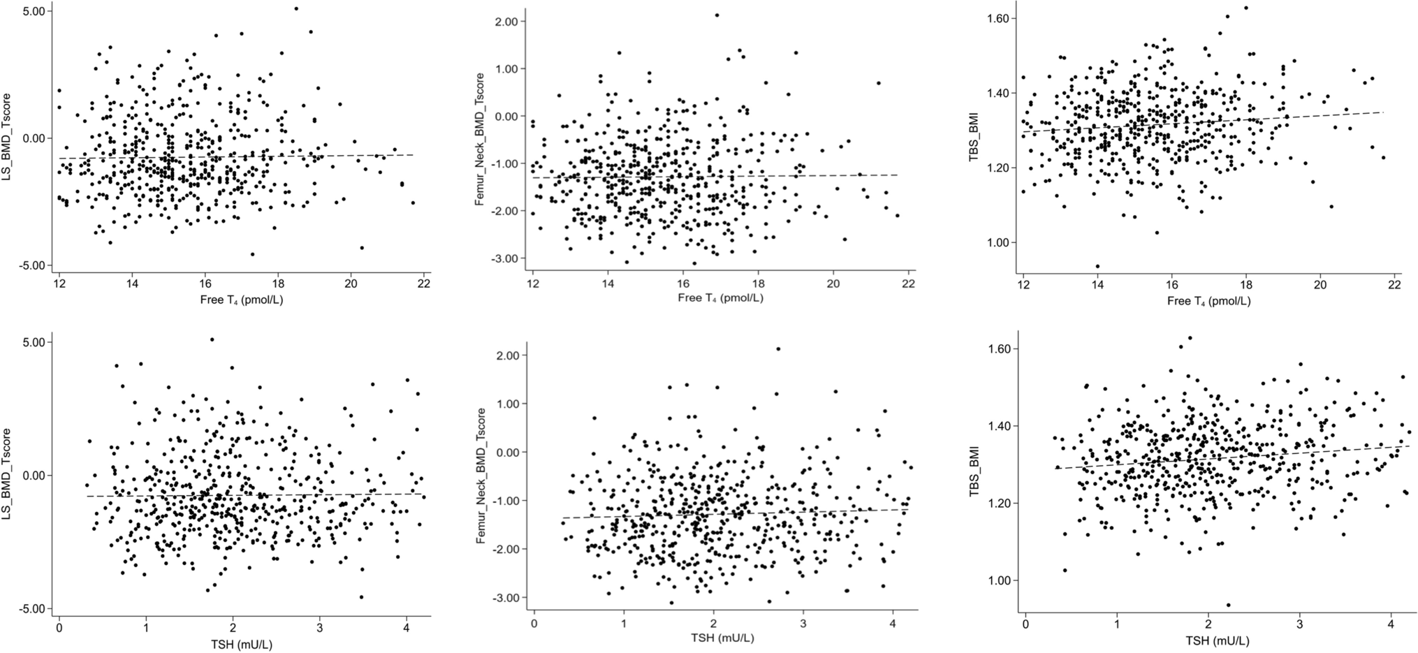 The primary endpoint of this study was to analyze the relation between fT4 and TSH in the normal range and bone measurements parameters (lumbar spine BMD, femoral neck BMD, total hip BMD, and TBS). The primary endpoint included an exploratory comparison of two subgroups divided by the medians of TSH and fT4: high fT4/low TSH and low fT4/high TSH. The secondary endpoint was to analyze the association between fT4 and TSH measured at baseline and the incidence of major osteoporotic fracture 5-year later.
