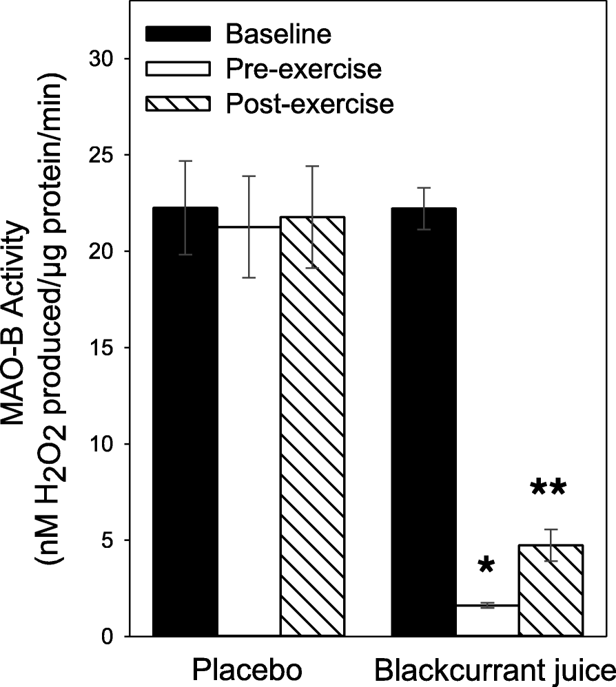 17] to select a suitable BJ dose and pre-exercise consumption time to maximize the potential influence on positive affective responses during a low impact exercise. Indeed, we found that plasma collected 1 h after BJ (4.8 mg/kg bodyweight) consumption showed a dramatic acute decline (> 90%) in platelet MAO-B activity, which was still detectable in participant’s plasma once they had stopped exercise, even those who walked for 2 h. Furthermore, although the plasma polyphenolic bioavailability profile and identification of the polyphenol bioactive(s) was not the focus of this study, the observed post-consumption bioefficacy of BJ on MAO-B activity supports Watson’s et al. [