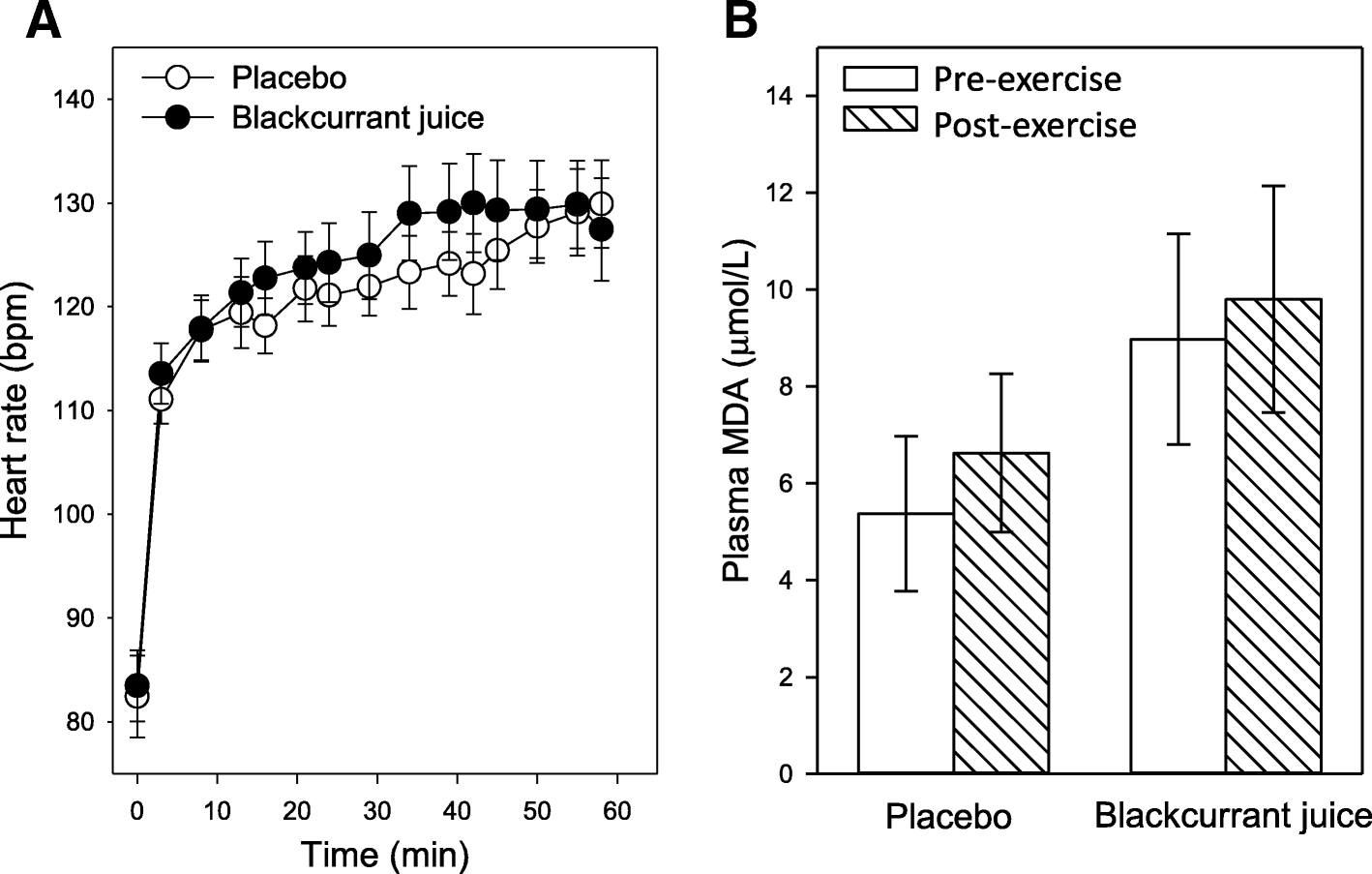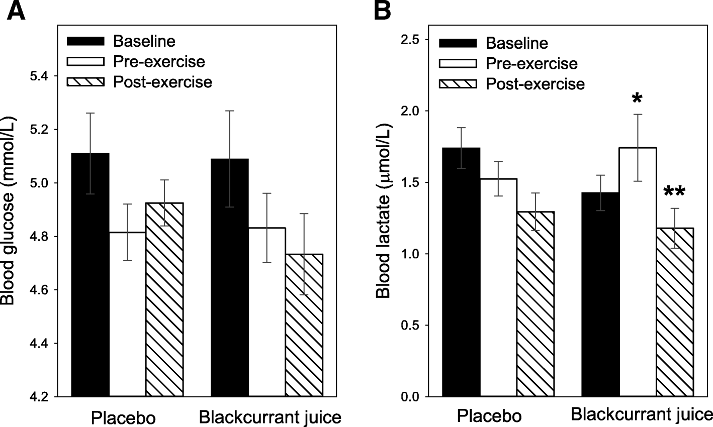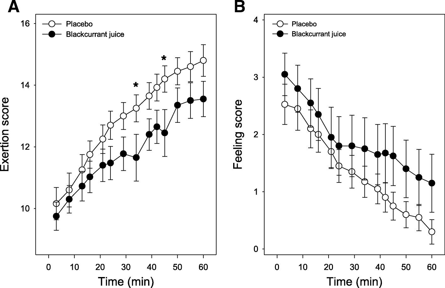 34], we cannot exclude the possibility that transient changes in blood lactate observed in the BJ group, prior to and during exercise, may be the result of blackcurrant-derived polyphenols potential influence on energy glycolytic metabolism and central affective responses.