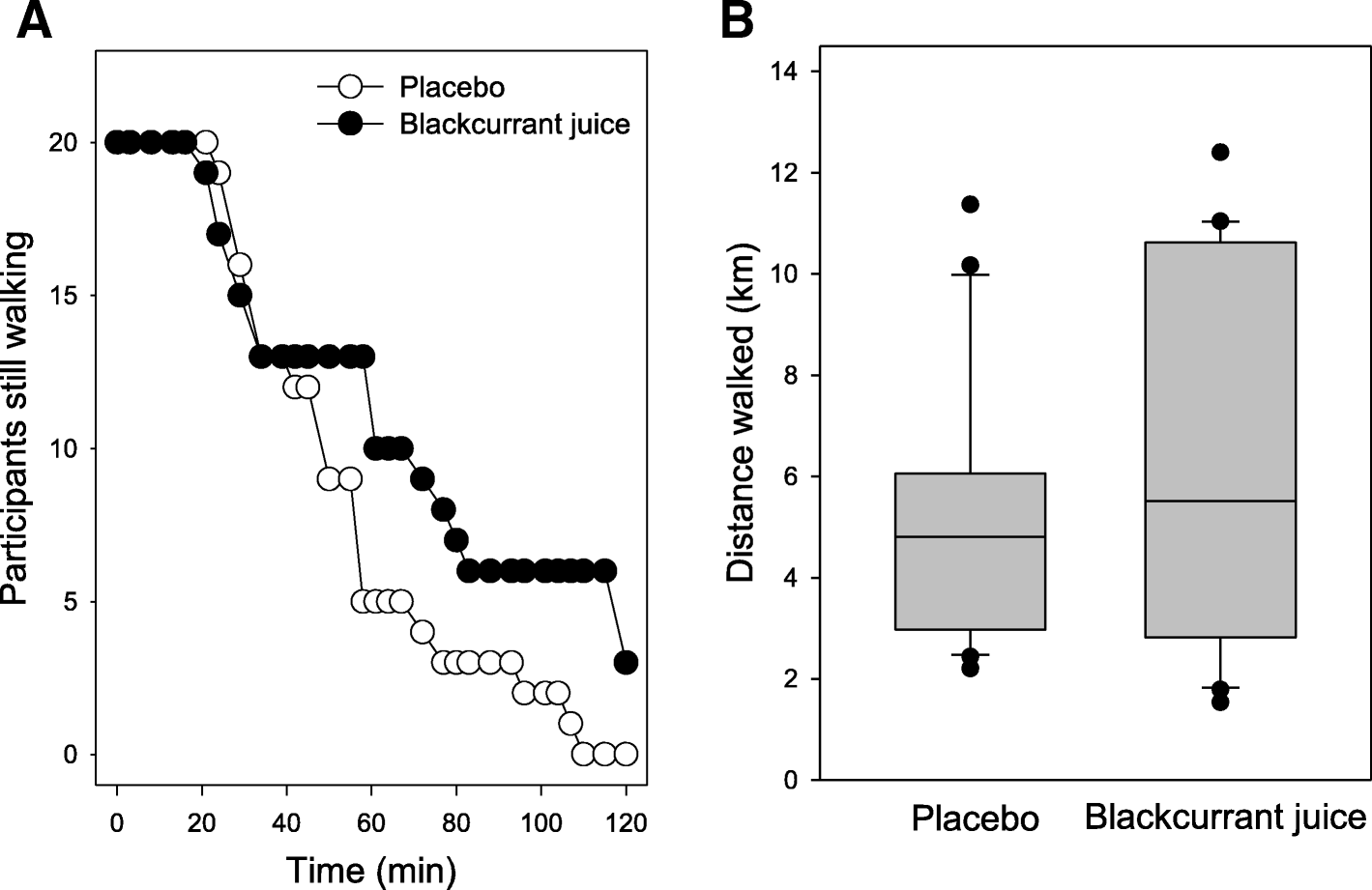Applying a low impact treadmill walking pace in this study that was predicted to minimise peripheral fatigue and exercise-induced oxidative stress enabled us to explore the efficacy of the BJ (rich in polyphenols) in supporting a positive affective response, and motivation to exercise. Participant affective responses varied over the length of the walk and were linked to participant walk time and drop-out rate. Participant’s perception of fatigue in the PLA group was consistently higher than those who consumed the BJ drink over the first 60 mins walking period. This was despite participants’ peripheral responses (HR, blood lactate and MDA) to the exercise being similar as well as displaying similar pre-exercise fitness scores. Affective mood responses decreased with walk time in both intervention groups, however after 20 mins differences between the PLA and BJ groups were observed. This, however, coincided with the beginning of participant’s drop-out and therefore, due to the small number of individuals taking part in this preliminary study, cannot exclude the possibility that the participants still walking after 60 mins may have exhibited an innate self-motivation to exercise irrespective of the nutrition group they were assigned to, although calculation of Cohen’s
