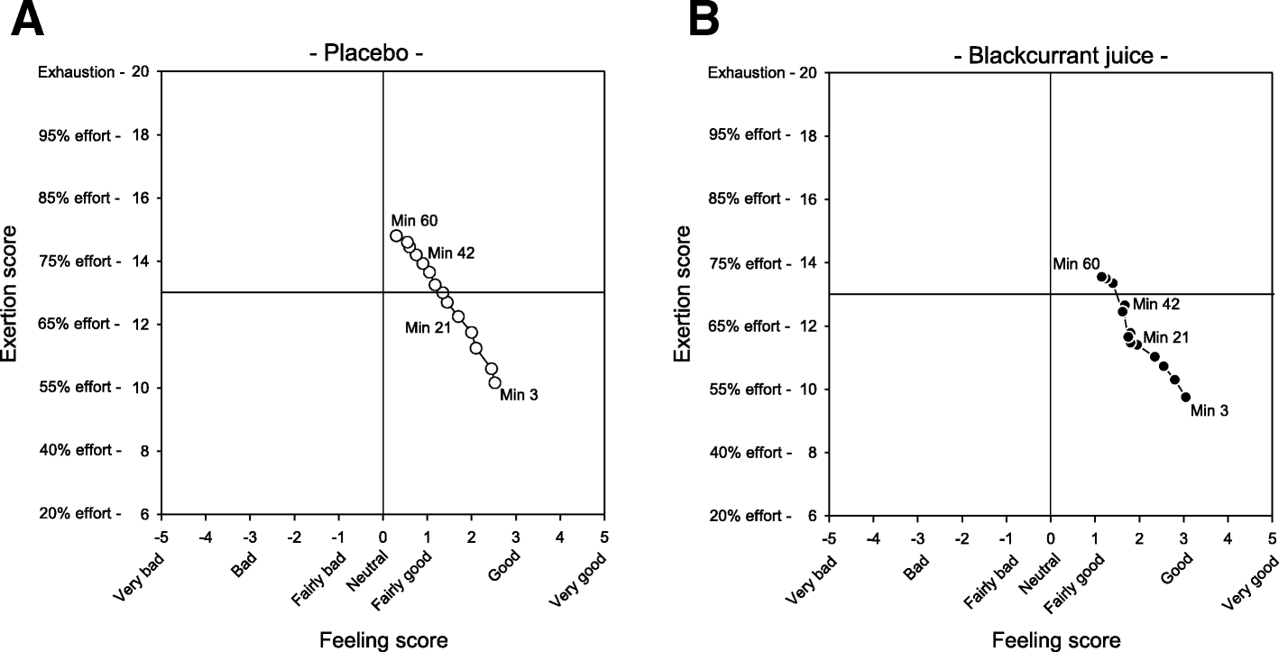 29] was applied. Affective responses by participants in the PLA group revealed a clear inverse linear relationship between perceived exertion and mood. This was not as apparent in the BJ group, suggesting that blackcurrant-derived polyphenolic compounds maybe having an impact on central affective responses resulting in the skewed inverse relationship observed between the perceived EF and FS during exercise. The cause for this, although unknown, may involve blackcurrant polyphenols modulating neural pathways primarily involved in perceived fatigue, and supports this observation reported by us [
