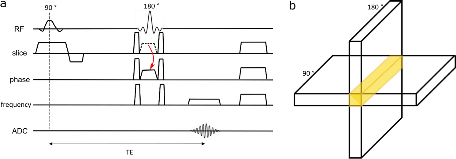 a SELINE sequence. Note the absence of phase-encoding gradients and the two different orientations of the 90° and 180° gradients to excite and refocus perpendicular planes. The gradient was moved from the slice-selection direction to the phase-encoding direction, as indicated by the red arrow. Pairs of crusher gradients were added around the refocusing gradient in every direction to avoid free induction decay artefacts, while spoilers were introduced at the end of the sequence to eliminate residual transverse magnetization. b Excitation and refocusing of 2 perpendicular planes, leading to a signal coming from a beam, indicated in yellow