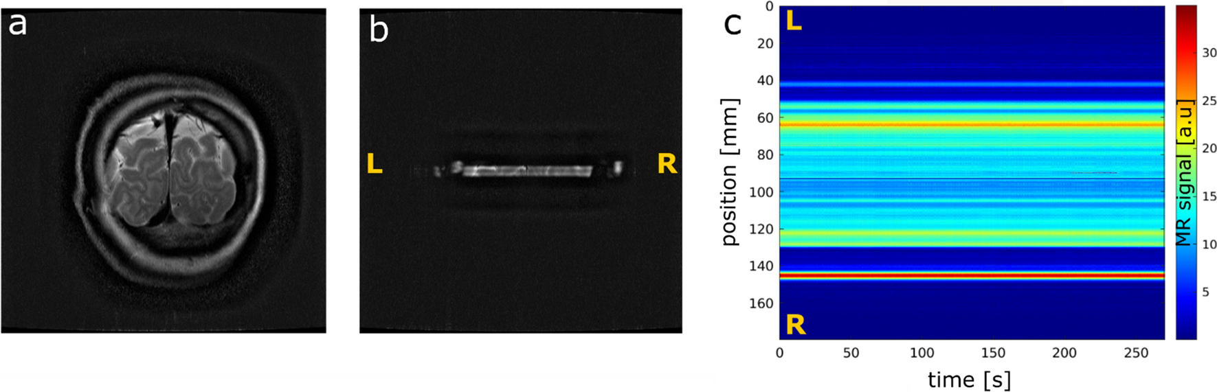 Figure 2 shows an example coronal slice (a), the associated LSD image (b), with the signal coming from the intersection of excited and refocused planes, and an example line-scanning acquisition, depicting the evolution of the MR signal for each voxel (position), across time (c).