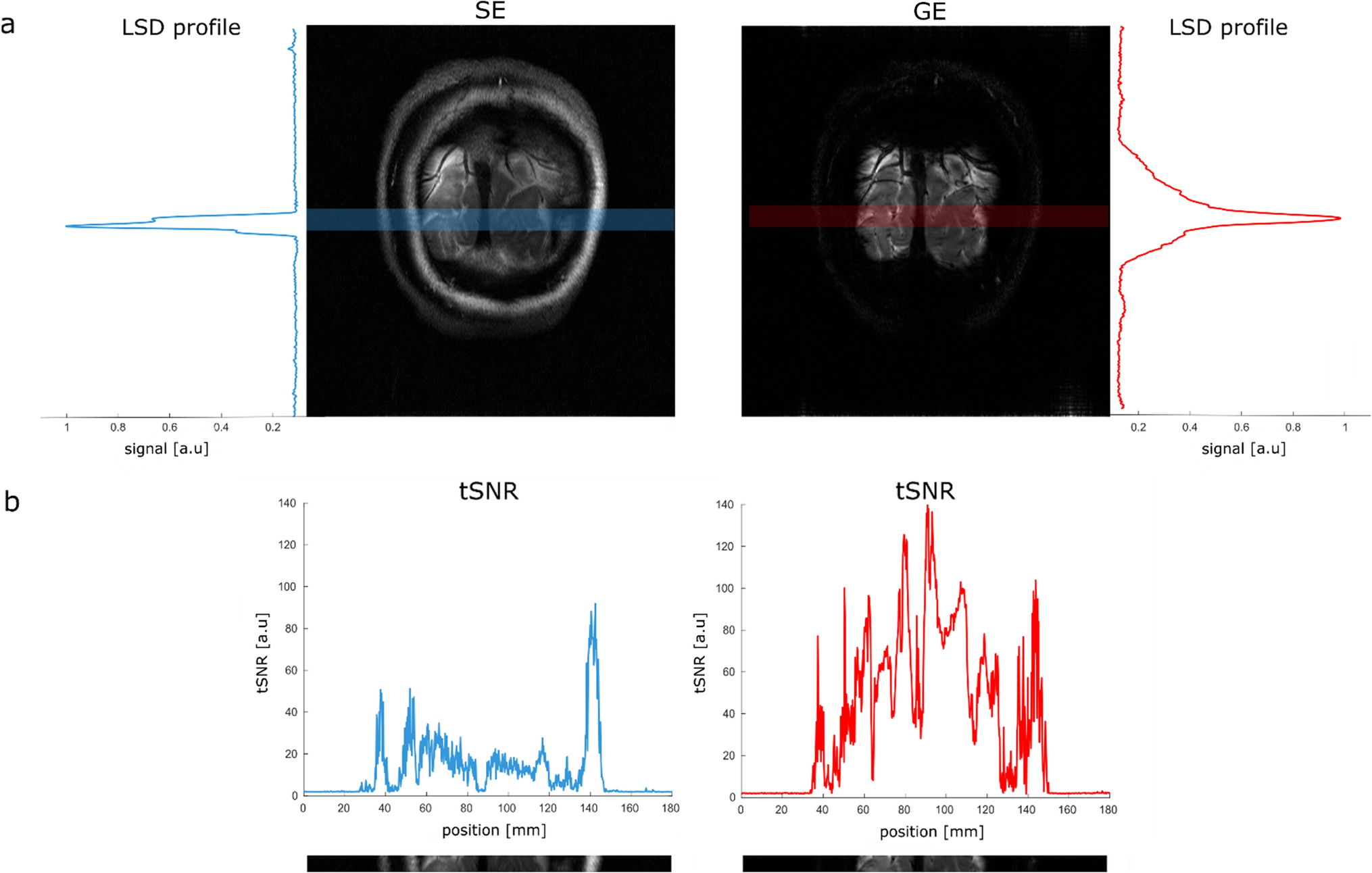 a Normalized LSD profile for spin-echo (blue line) and gradient-echo (red line), plotted perpendicularly to the slice, where the region of the line is highlighted in the blue and red box. Note the improved line definition in SELINE. b tSNR for spin-echo line-scanning (blue line) and gradient-echo line-scanning (red line), with the anatomical references at the bottom (spatially matched)