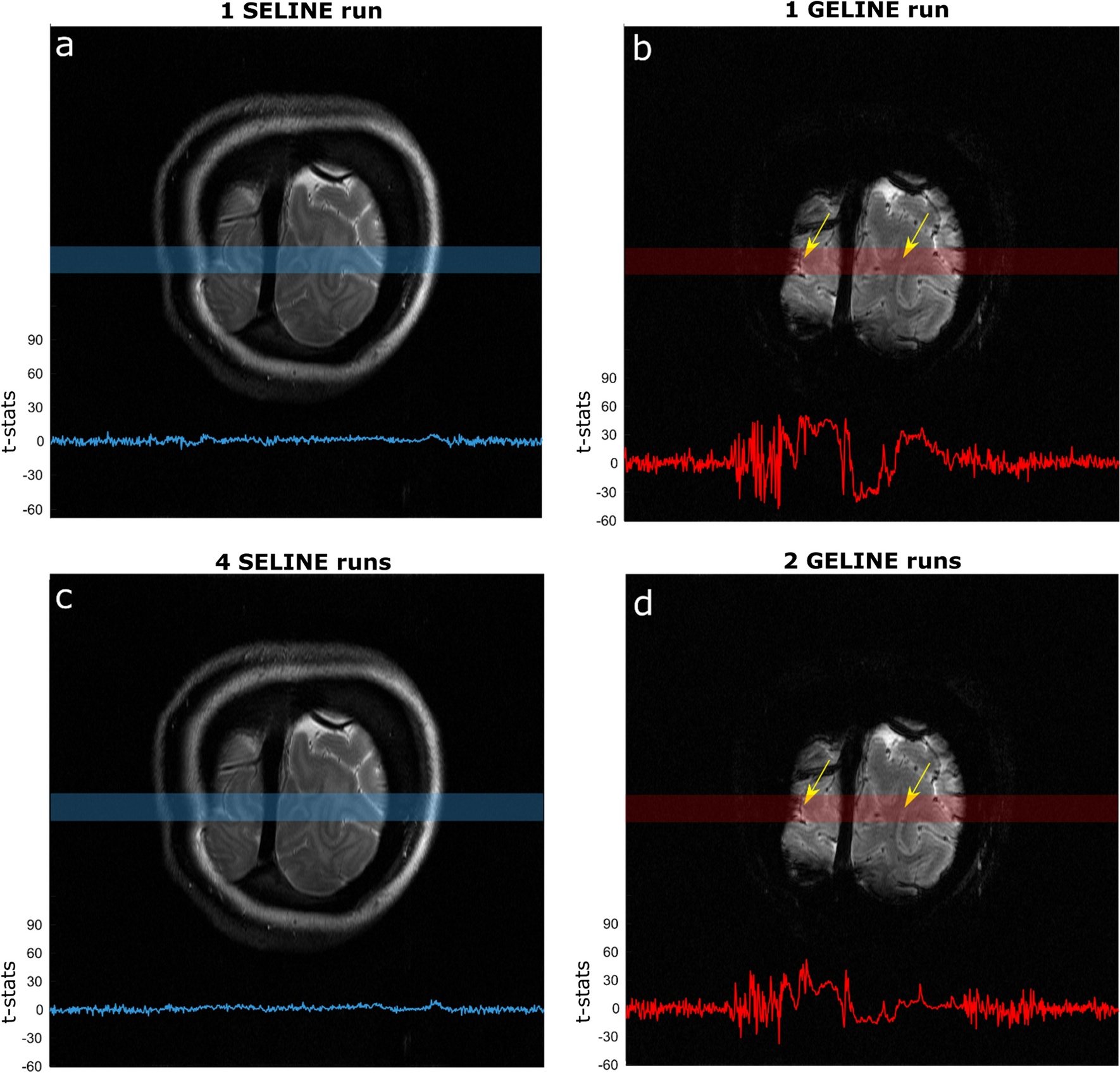 a t-stats for 1 SELINE acquisition, b 1 GELINE acquisition, c 4 runs average SELINE acquisition and d 2 runs average GELINE acquisition, overlaid on the acquired slices, for the same representative participant. The light blue and red boxes indicate where the line was positioned, and the yellow arrows highlight gray matter regions