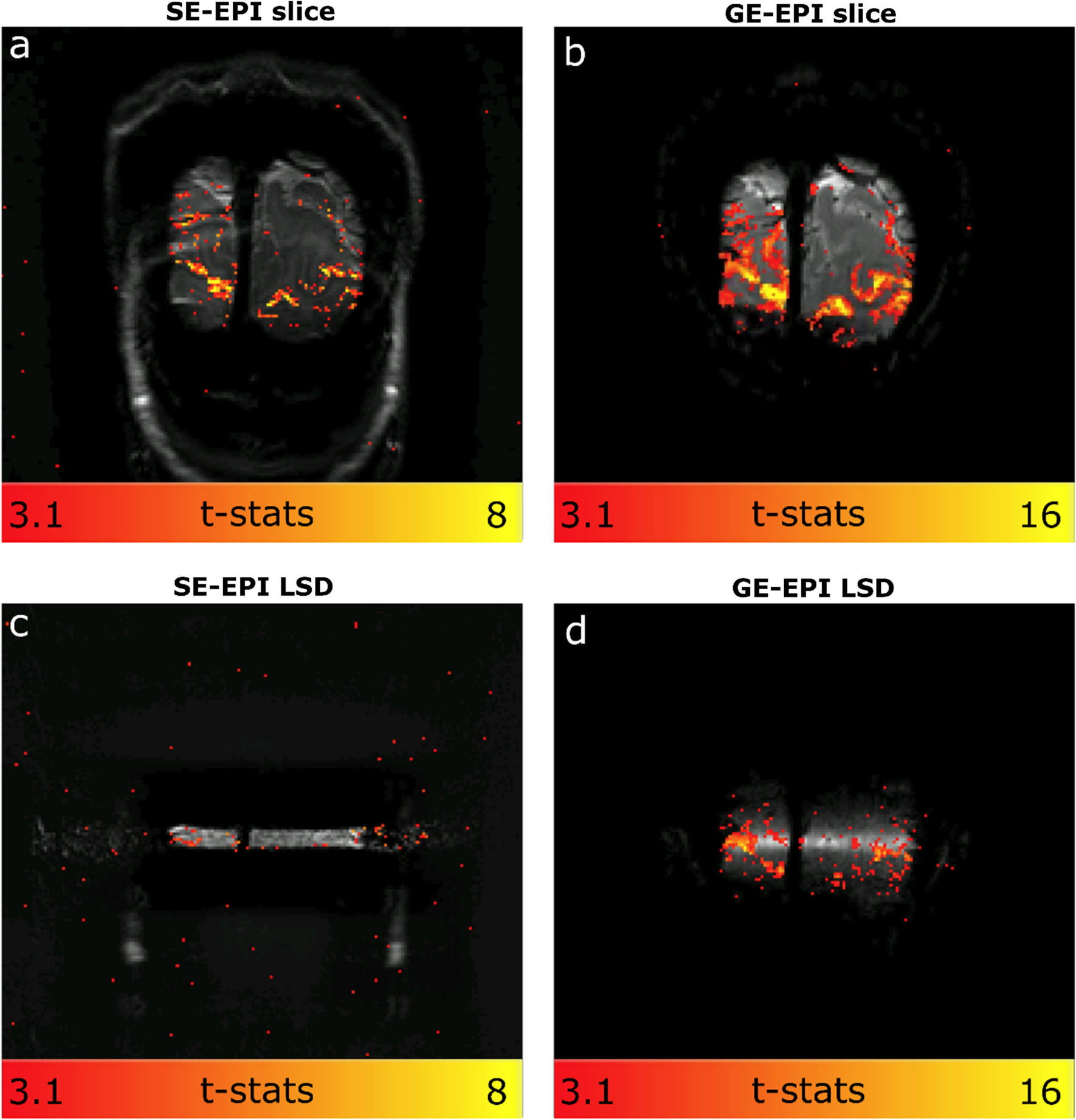 a t-stats for SE-EPI slice acquisition, b GE-EPI slice acquisition c SE LSD image acquisition and d GE LSD image. The spatial resolution is 1.5 mm isotropic in all four acquisitions