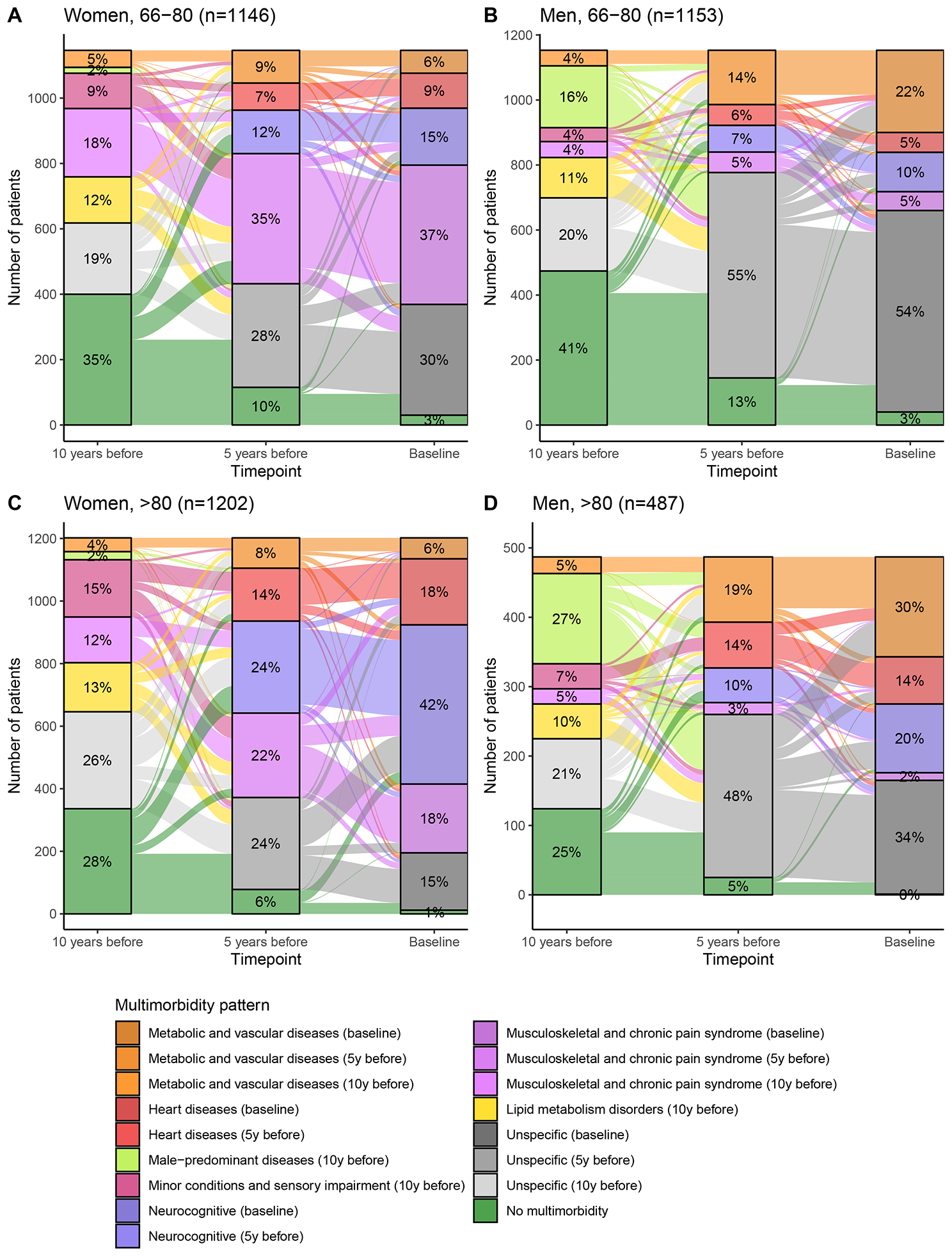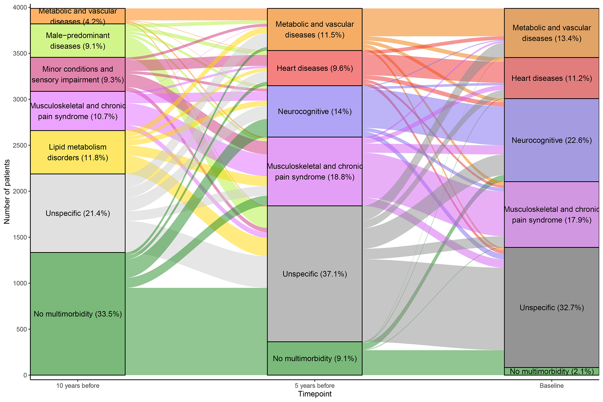Each patient was allocated to the most probable cluster at each of the time points. Percentages of patients in each cluster were calculated, including patients with zero or one chronic conditions, which were allocated to a “No multimorbidity” group. Then, trajectories of each patient through the three time points were established. Percentages of patients for all possible trajectories were calculated for the three time points or pairwise (10 years before vs. 5 years before, 5 years before vs. baseline).