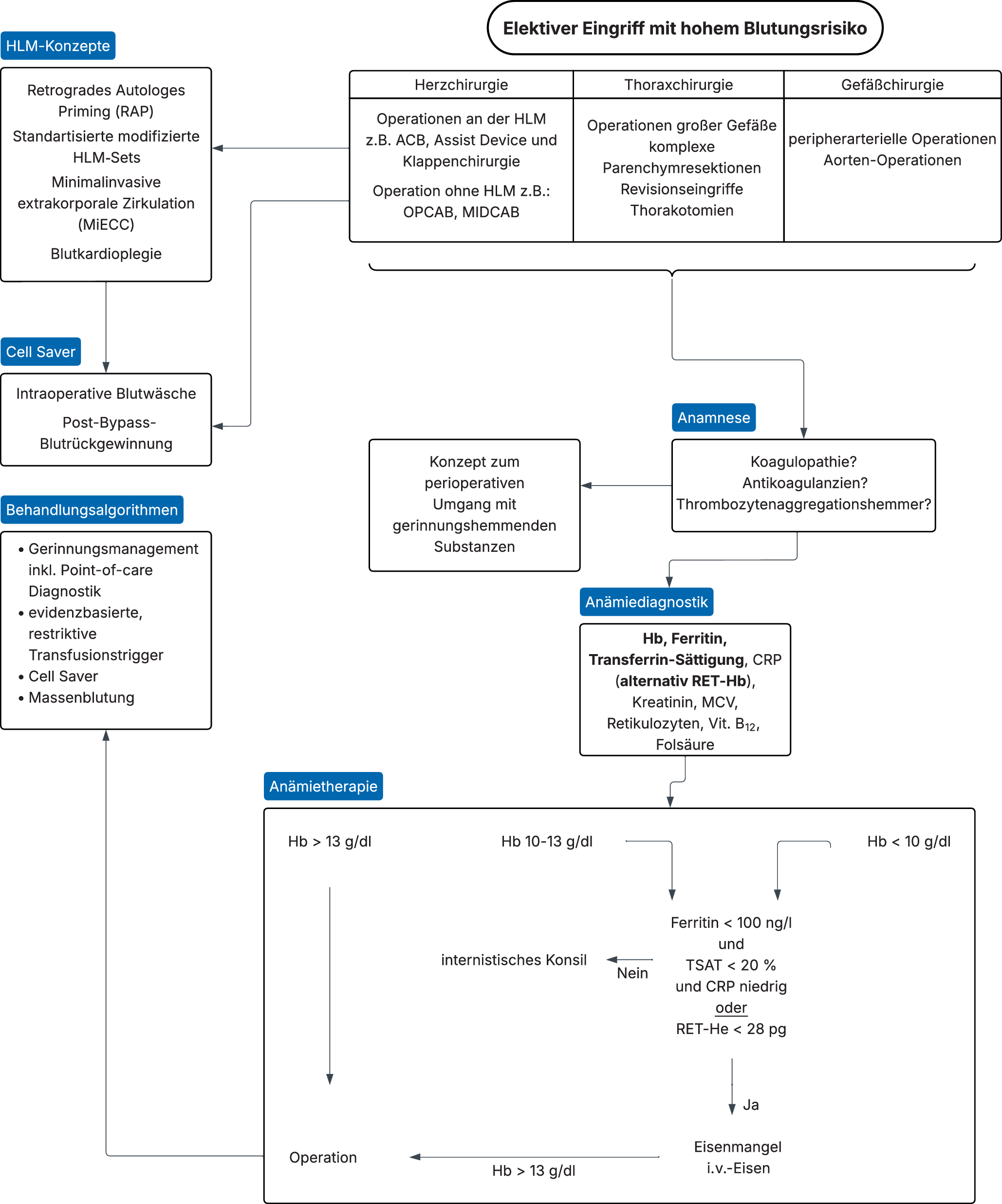 Präoperative Anämieerkennung und -therapie: Frühzeitiges Screening auf Anämie und Eisenmangel ist essenziell. Die Behandlung erfolgt individuell, z. B. mit i.v.-Eisen, Erythropoetin oder Vitamin‑B12-/Folsäuresupplementation. Ziel ist es, die präoperative Hämoglobinkonzentration zu optimieren, um patienteneigene Ressourcen zu steigern und Fremdbluttransfusionen zu vermeiden.
