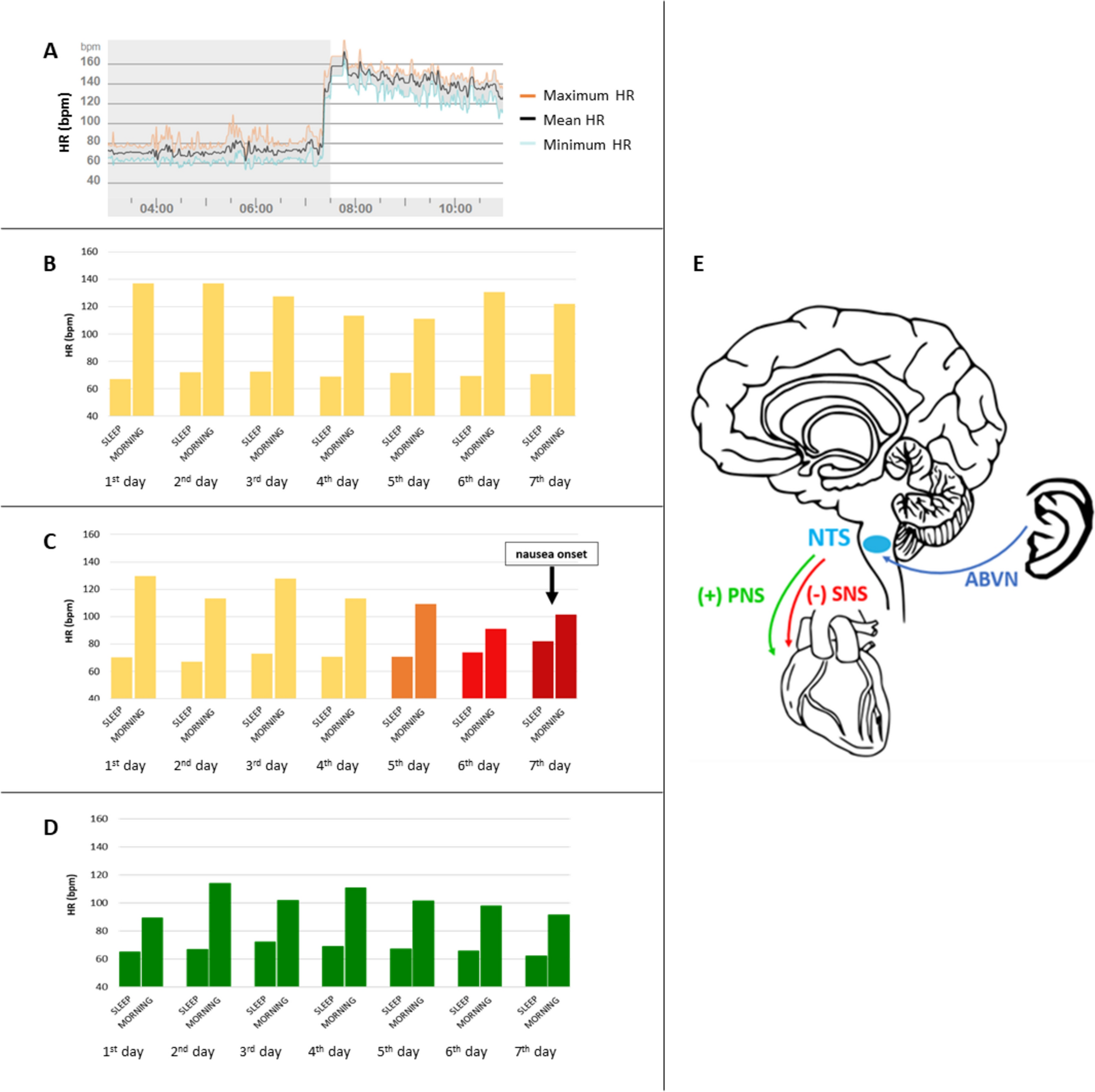 a Cardiac response to orthostatic position after awakening: example of HR trend in the hours before and after awakening. b Mean HR of the 4 h preceding (sleep) and following (morning) awakening during the first week of monitoring. c Mean HR of the 4 h preceding (sleep) and following (morning) awakening in the 7 days immediately preceding the vomiting episode. d Mean HR of the 4 h preceding (sleep) and following (morning) awakening after 3 months of tVNS treatment. e neuromodulatory pathway activated by tVNS. ABVN auricular branch of vagus nerve, HR heart rate, NTS nucleus tractus solitarius, PNS parasympathetic nervous system, SNS sympathetic nervous system, tVNS transcutaneous auricular vagal stimulation