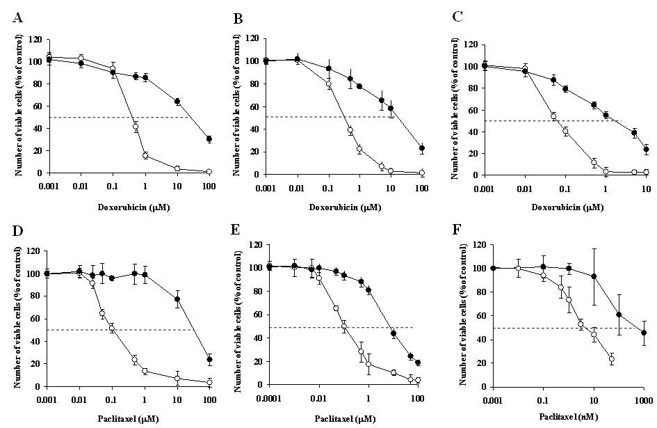 Cytotoxicity of doxorubicin and of paclitaxel for wild type cells and the corresponding MDR sub-line cells. A, B & C - doxorubicin. D, E & F - paclitaxel. A & D - AA8 & EmtR1 cell lines; B & E - MCF-7 & MCF-7/Mx cell lines; C & F - MDA-MB-231 & MDA-MB-231/Dox cell lines. Open symbols -wild type cell lines. Filled symbols - MDR cell sub-lines. Treatment duration - 72 h. Data presented as mean ± SEM of 12-20 replicate measurements from 3-5 experiments.