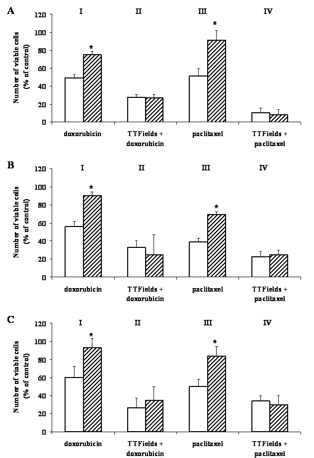 Effects of doxorubicin and paclitaxel when applied separately and in combination with TTFields on the viability of wild type and MDR cells. A - MDA-MB-231 & MDA-MB-231/Dox; B - MCF-7 & MCF-7/Mx; C - AA8 & EmtR1. Open bars - wild type cells; filled bars - MDR cell sub-lines. I & III - Separate exposures, II & IV - combined exposures. TTFields intensity - 1.75 V/cm. Doxorubicin concentrations: A - 0.04 μM; B - 0.5 μM; C - 0.6 μM. Paclitaxel concentrations: A - 5 nM; B -0.1 μM; C - 0.1 μM. Treatment duration - 72 h. Data presented as mean ± SEM of 24-36 replicate measurements from 3-5 experiments. * P < 0.01, student t-test.