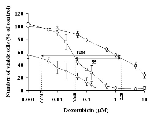 Figure 2 compares between the cytotoxicity-dose curves of chemotherapeutic agents (paclitaxel and doxorubicin) of wild type cells and MDR sub-lines. It is seen that the resistivity of the MDR sub-lines is manifested in a significant right shift of the drug cytotoxicity-dose curves. As a result of these shifts the calculated IC50 values (Table 1) for doxorubicin and paclitaxel, for all pairs of WT-MDR cell lines studied, give very high IC50 ratios (resistance index RI): 55 - 79 for doxorubicin and 128 - 653 for paclitaxel.