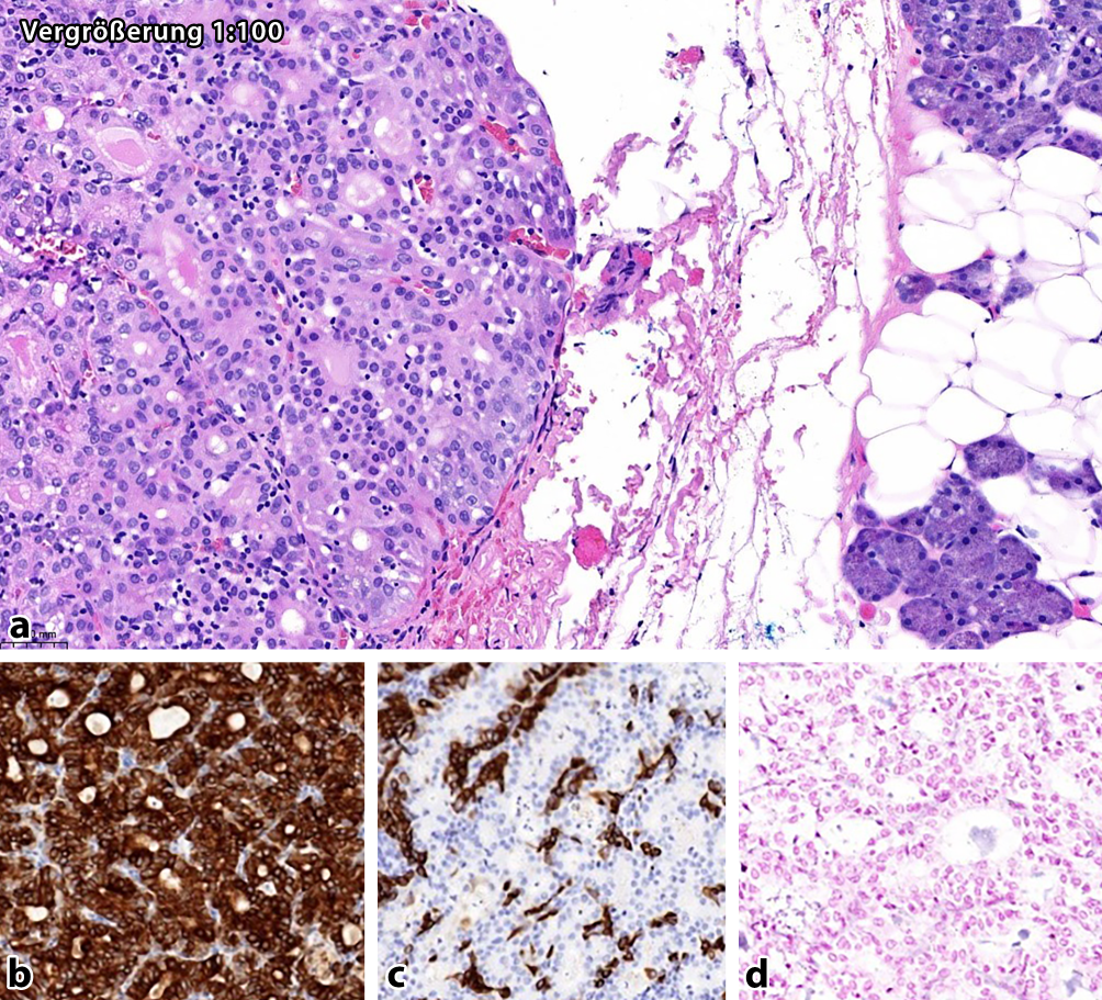 d). In Zusammenschau der Anamnese, der Morphologie und Immunhistochemie stellten wir die Diagnose eines Schaltstückadenoms („intercalated duct adenoma“). Schaltstückadenome sind seltene, benigne Speicheldrüsentumoren, die häufig inzidentell, insbesondere im Rahmen von anderen, meist neoplastischen Speicheldrüsenerkrankungen gefunden werden [