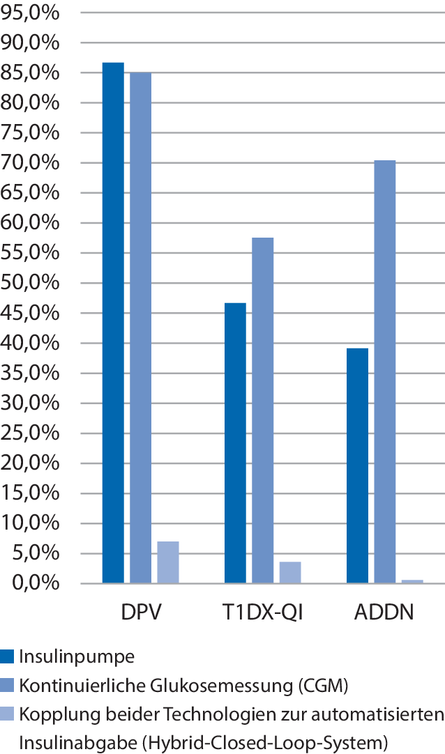 Daten aus dem deutsch-österreichischen DPV-Register (DPV: Diabetespatientenverlaufsdokumentation) und dem US-amerikanischen T1D Exchange Register zeigten in den letzten Jahren einen stetigen Anstieg der CGM-Nutzung, insbesondere bei Kindern (DPV: 40 % im Jahr 2017 auf 76 % im Jahr 2020; T1D Exchange Register: 25 % im Jahr 2017 auf 49 % im Jahr 2020, [9, 10]). Jüngste Statistiken aus Australien bestätigen ebenfalls eine weit verbreitete Anwendung, wobei 79 % der unter 21-Jährigen CGM-Systeme verwenden [11]. Neben der Verbesserung der Genauigkeit und der besseren Verfügbarkeit von CGM-Systemen ist dies v. a. auch auf die Kostenübernahme durch die öffentliche Hand bzw. Versicherungen/Krankenkassen zurückzuführen. Auch Insulinpumpen mit einer Vielzahl von Funktionalitäten sind bei Kindern und Jugendlichen weit verbreitet, mit Nutzungsraten bis zu 90 % je nach Altersgruppe [12]. Im Bereich der Kleinkinder unter 6 Jahren ergab eine neue Analyse der Register DPV (Deutschland/Österreich/Luxemburg/Schweiz), T1DX-QI (T1D Exchange Quality Improvement, USA) und ADDN (Australasian Diabetes Data Network, Australasien) mit Daten von 8004 Kindern (2019–2021) eine unterschiedliche Nutzung von Diabetestechnologien: Insulinpumpen wurden im DPV-Register zu 86,6 %, im T1DX-QI zu 46,6 % und im ADDN zu 39,2 % verwendet. Die kontinuierliche Glukosemessung (CGM) wurde im DPV-Register zu 85,1 %, im T1DX-QI zu 57,6 % und im ADDN zu 70,5 % genutzt ([13]; Abb. 1).
