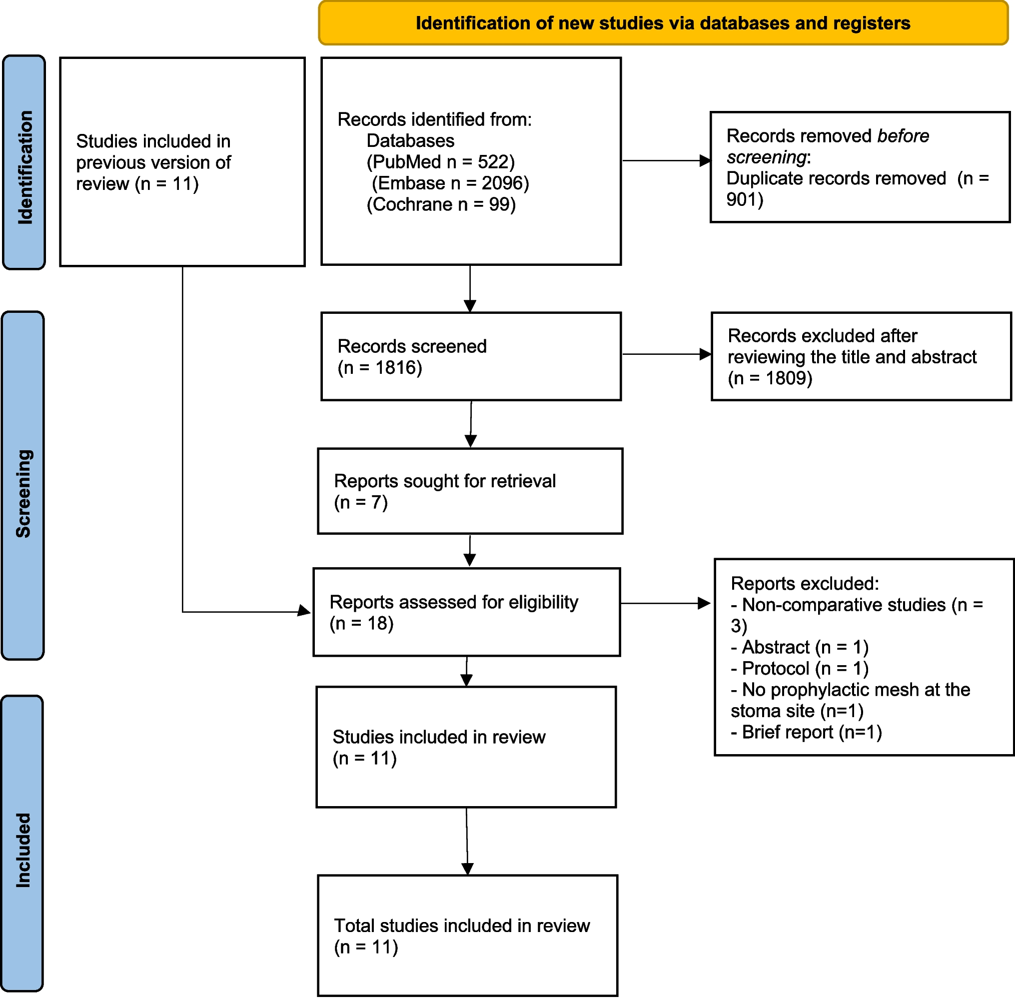 Randomized controlled trial/Finland | Ileostomy closure (n = 94) | Prosthetic mesh (n = 47) Biological mesh (n = 50) | Retromuscular | Synthetic mesh: 2 (4%) Biological Mesh: 2 (4%) | Synthetic mesh: 1 (2%) Biological mesh: 2(4%) | 10 months |