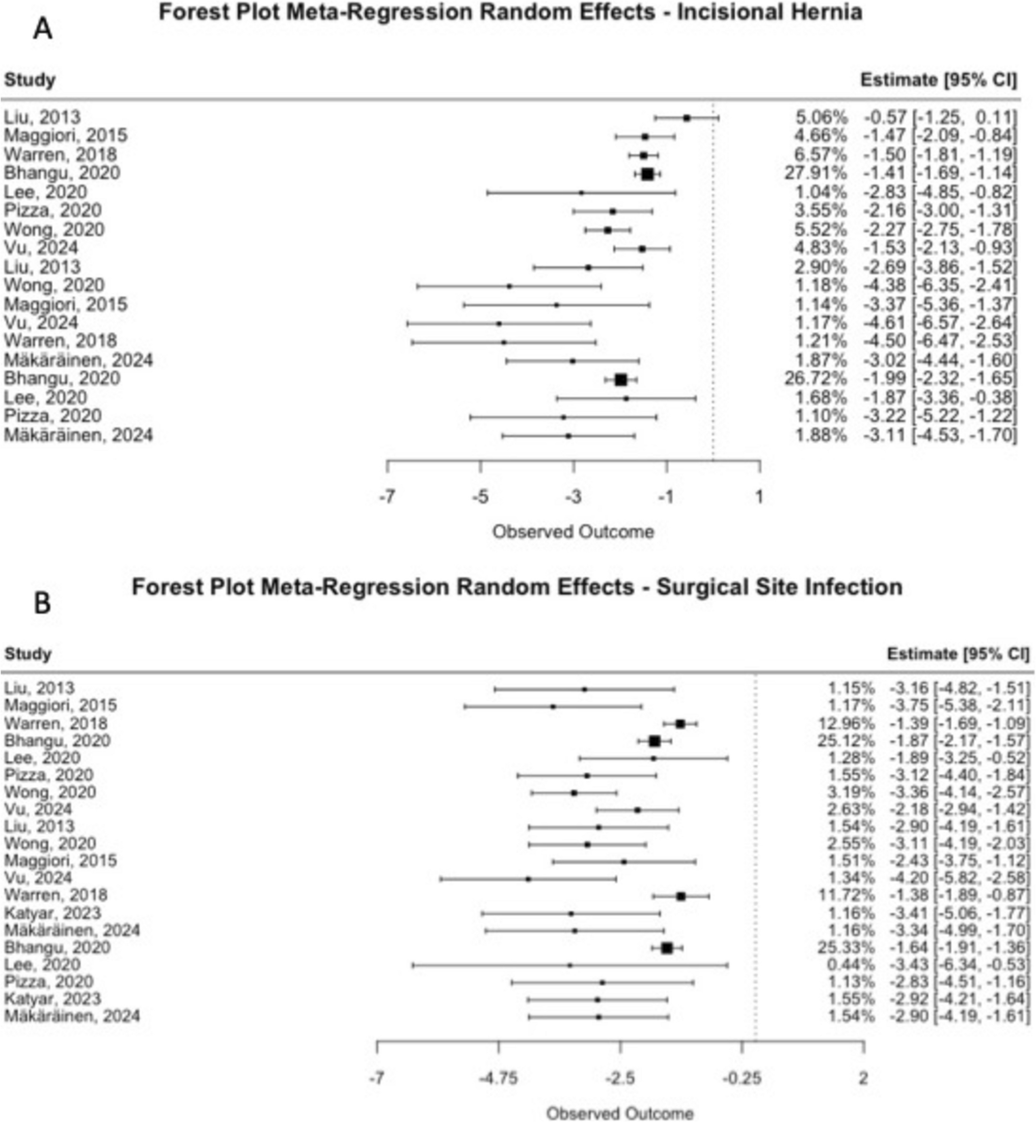 Vu, 2024 [23] | Retrospective cohort/United States | Colostomy closure (n = 46). Ileostomy closure (n = 128). Mesh (n = 101). No mesh (n = 73) | Biosynthetic (GORE BIO-A) | Retromuscular | Mesh group: 1 (1%) No mesh group: 13 (17.8%) | Mesh group: 1 (1%) No mesh group: 7 (9.6%) | Mesh group: Median 45.2 months (Range: 0.79–74.3) No mesh group: Median 43.2 (Range: 0.82–69.0) |