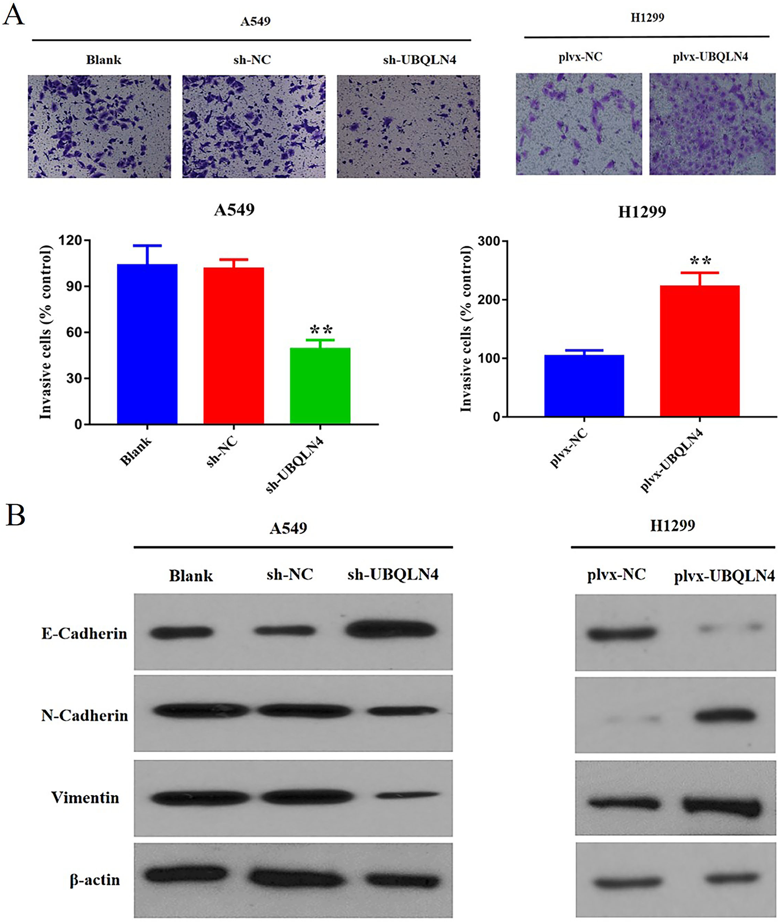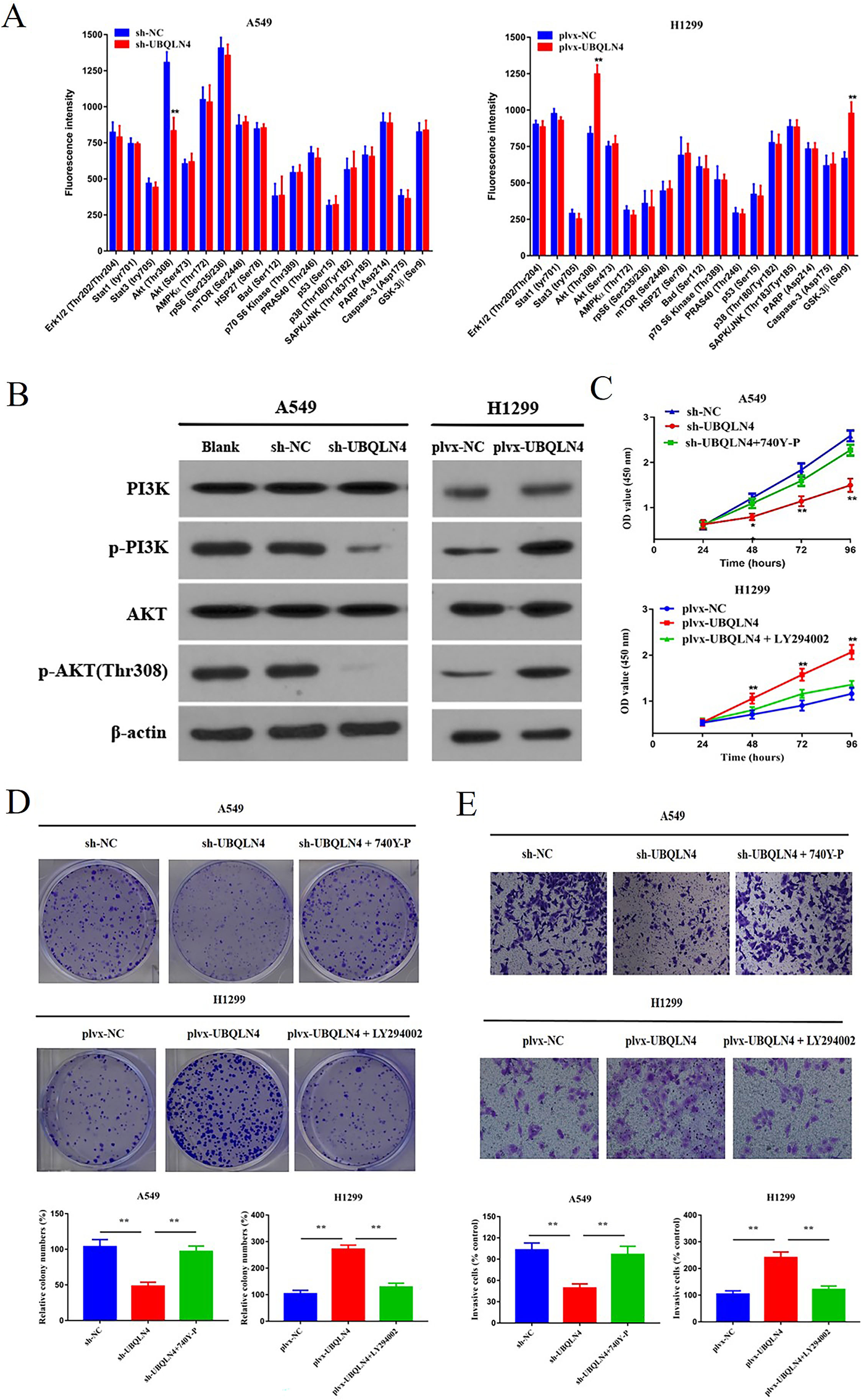 2023). We investigated the association between UBQLN4 and EMT, revealing that decreases UBQLN4 expression in NSCLC cells led to an increase in the epithelial marker (E-cadherin) and a decrease in mesenchymal markers (N-cadherin and vimentin). This shift indicated a weakened EMT process in NSCLC cells with low UBQLN4 expression. Thus, the enhanced invasive capability of NSCLC cells with high UBQLN4 expression is correlated with intensified EMT. Our subsequent study found that UBQLN4 expression affected the activation of PI3K/AKT signaling pathway. We can speculate with the above data that some important genes regulating the EMT process are also affected by this pathway.
